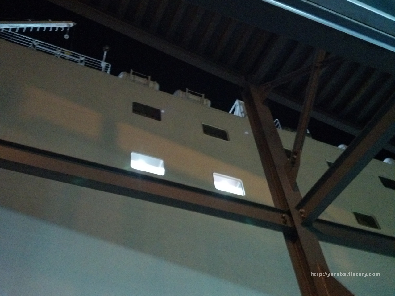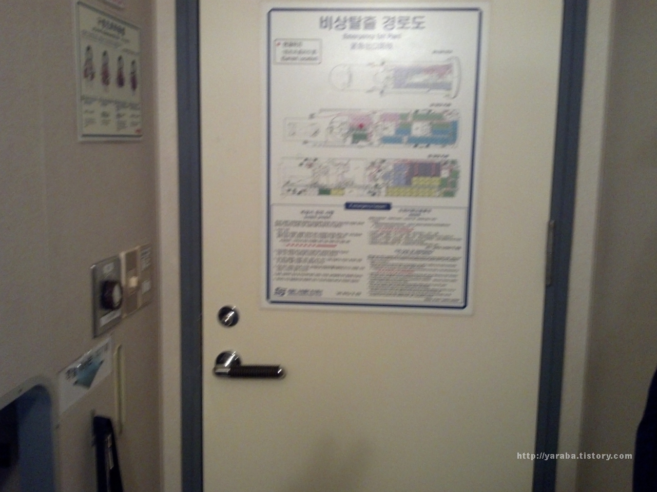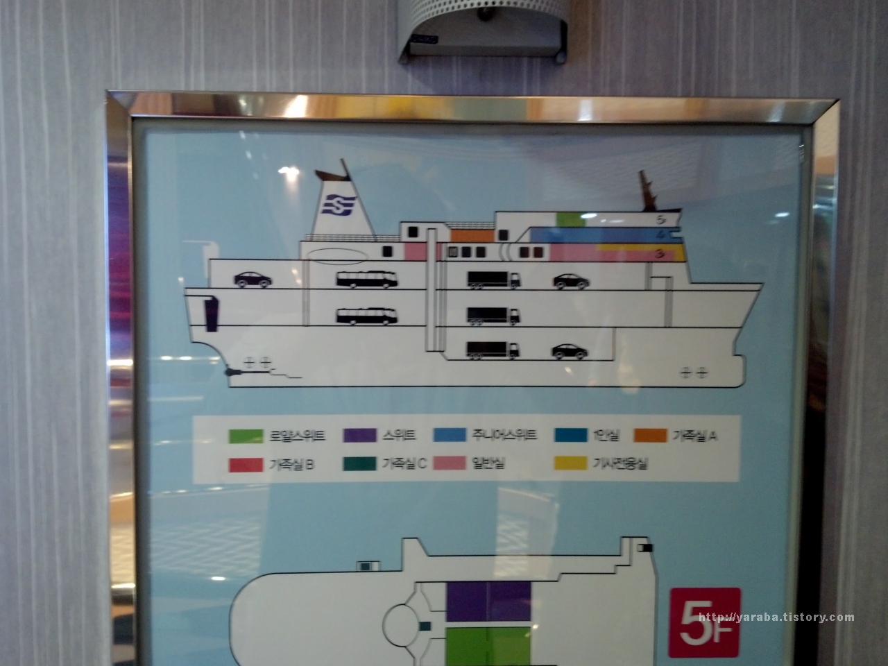 배의 구조를 안내하고 있는 안내판의 모습입니다. 배의 아래쪽에는 차량들을 싣고 3층부터 5층까지 객실들을 배치하고 있는 형태입니다. 1인실은 4층에 있으니 일반실보다 흔들림도 덜하고 좋았습니다.