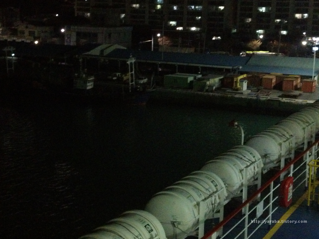 출항을 앞둔 분주한 시간이지만 간판에서 바라보는 항구의 풍경은 고요하기만 합니다. 배 양측에 동글동글 매달려 있는 것은 가까이 가서 살펴보니 비상용 구명보트였습니다.