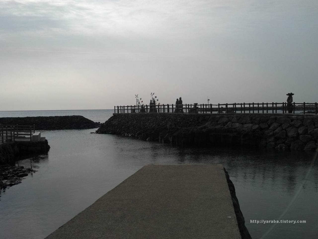 구름 낀 온평포구가 낭만적인 분위기 가운데 올레길 걷기를 시작하게 합니다. 올레길 3코스의 시작점이 있는 온평 포구는 현재는 사용하지 않고 서쪽에 추가로 만들어 놓은 조금 더 큰 포구를 이용한다고 합니다. 그래서 이쪽의 작은 포구는 관광객들은 위한 다양한 장식들로 가득합니다.