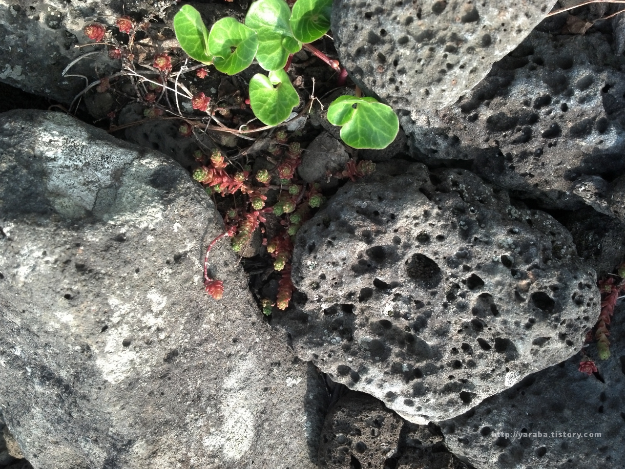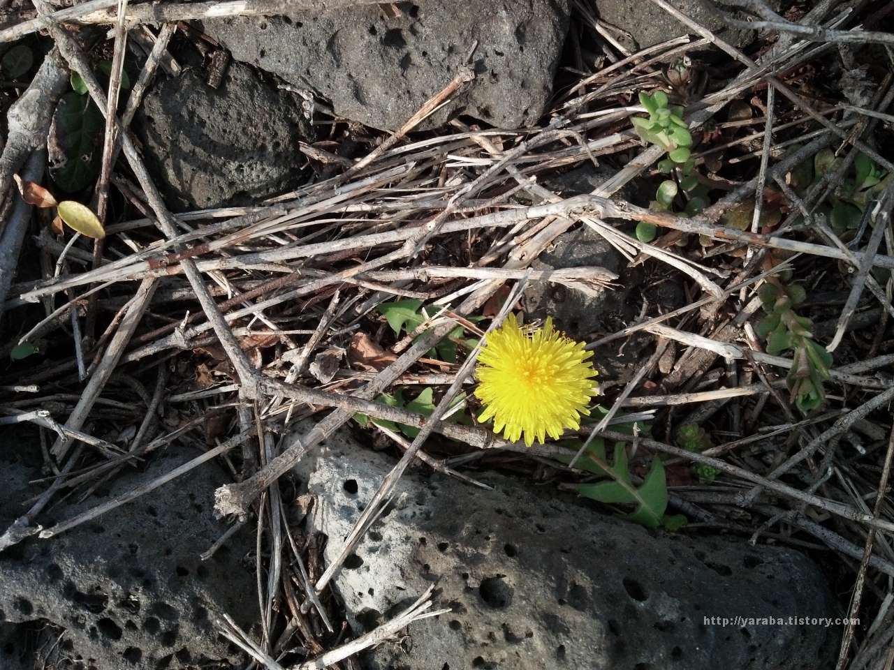 돌길을 걸을 때는 멀리 바라보기 보다 바로 발 앞을 주의 깊게 보며 걸어야 하는 법이지요. 자칫하면 돌에 걸려 넘어지거나 흔들리는 돌을 밟아 발목이 상할 수 있으니까요. 고개를 숙여 땅을 보며 걸을 때 주어지는 재미 중에 하나는 돌 틈에서 존재를 뽐내고 있는 들꽃을 만나는 것입니다. 어디서 날아왔을지 모를 민들레가 노란 꽃을 피웠습니다.