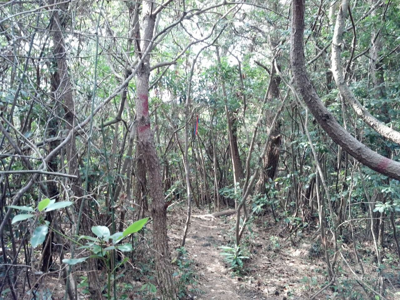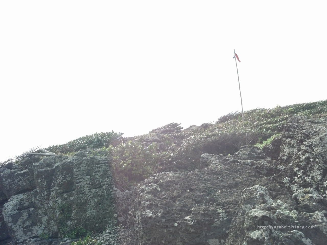 바위틈에 뿌리를 내리고 세찬 바람을 맞아 누워서 크고 있는 관목들 사이로 올레 리본을 매단 장대가 마치 프랑스의 혁명 한가운데서 깃발을 들고 진격하는 잔다르크의 모습을 연상시킵니다.