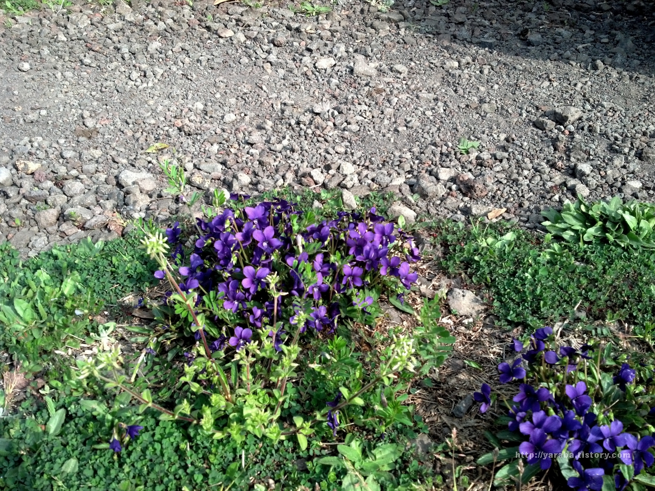 자갈밭 길가에 진한 보라색의 꽃을 피운 들꽃이 아름답습니다.