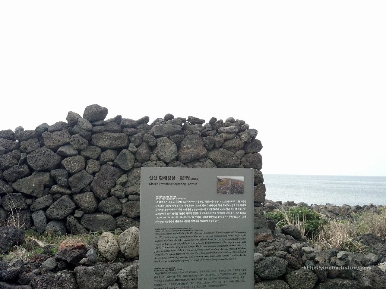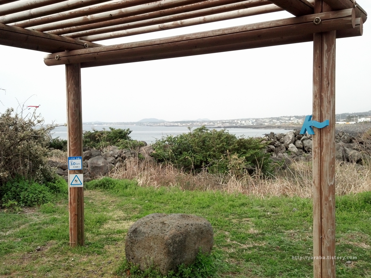 2014년 서귀포시가 체계적인 환해장성 관리를 위해서 복원을 했지만 정교하게 다듬어진 현무암으로 이루어진 장성의 모습은 이것이 옛 성인지 최근에 만들어진 돌 울타리인지 헷갈린 아쉬운 점이 있었습니다. 아무튼 신산 환해 장성 쉼터가 마련된 곳은 3-B 코스 14.4km 중에서 3Km에 해당하는 지점입니다. 쉼터 뒤편으로 멀리 앞으로 한참 걸어가야 할 표선 해변이 어른 거립니다.