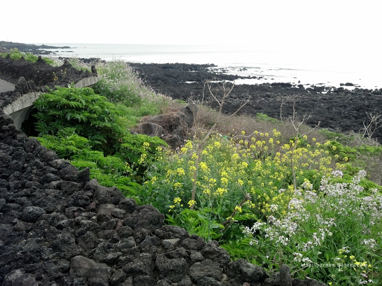 검은 현무암을 배경으로 초록, 노랑, 흰색이 제주의 봄을 한폭의 그림에 담아 놓았습니다.