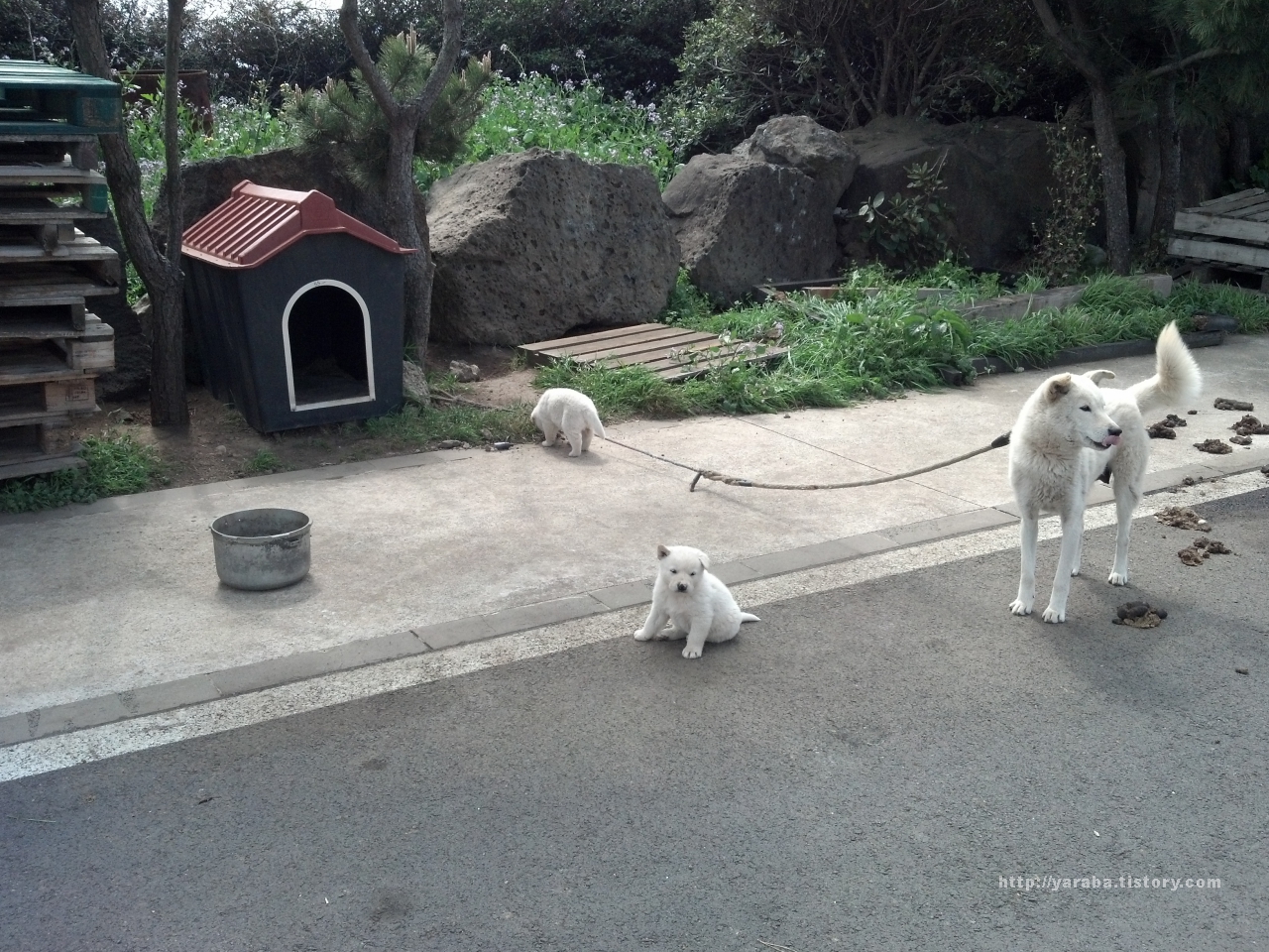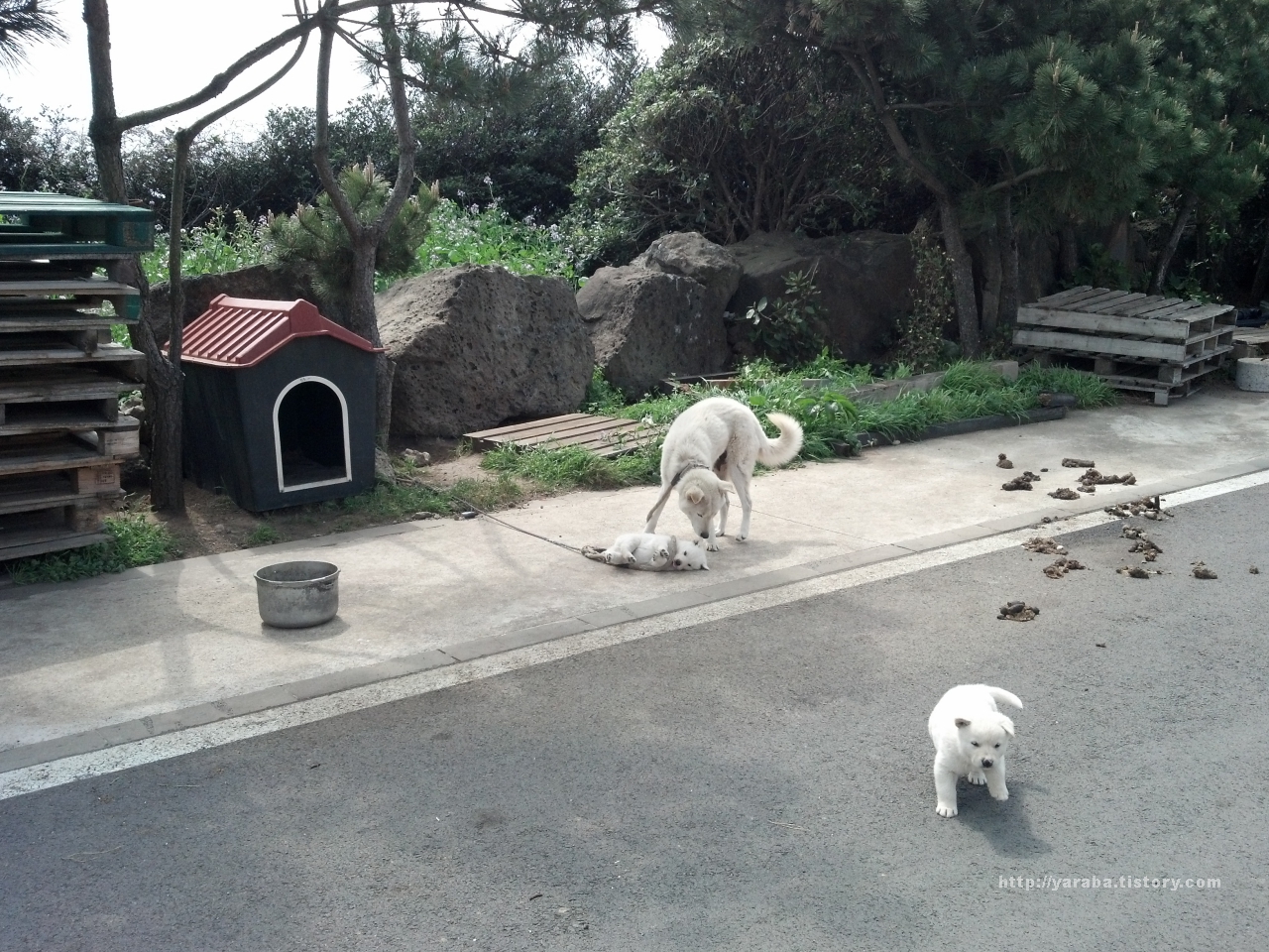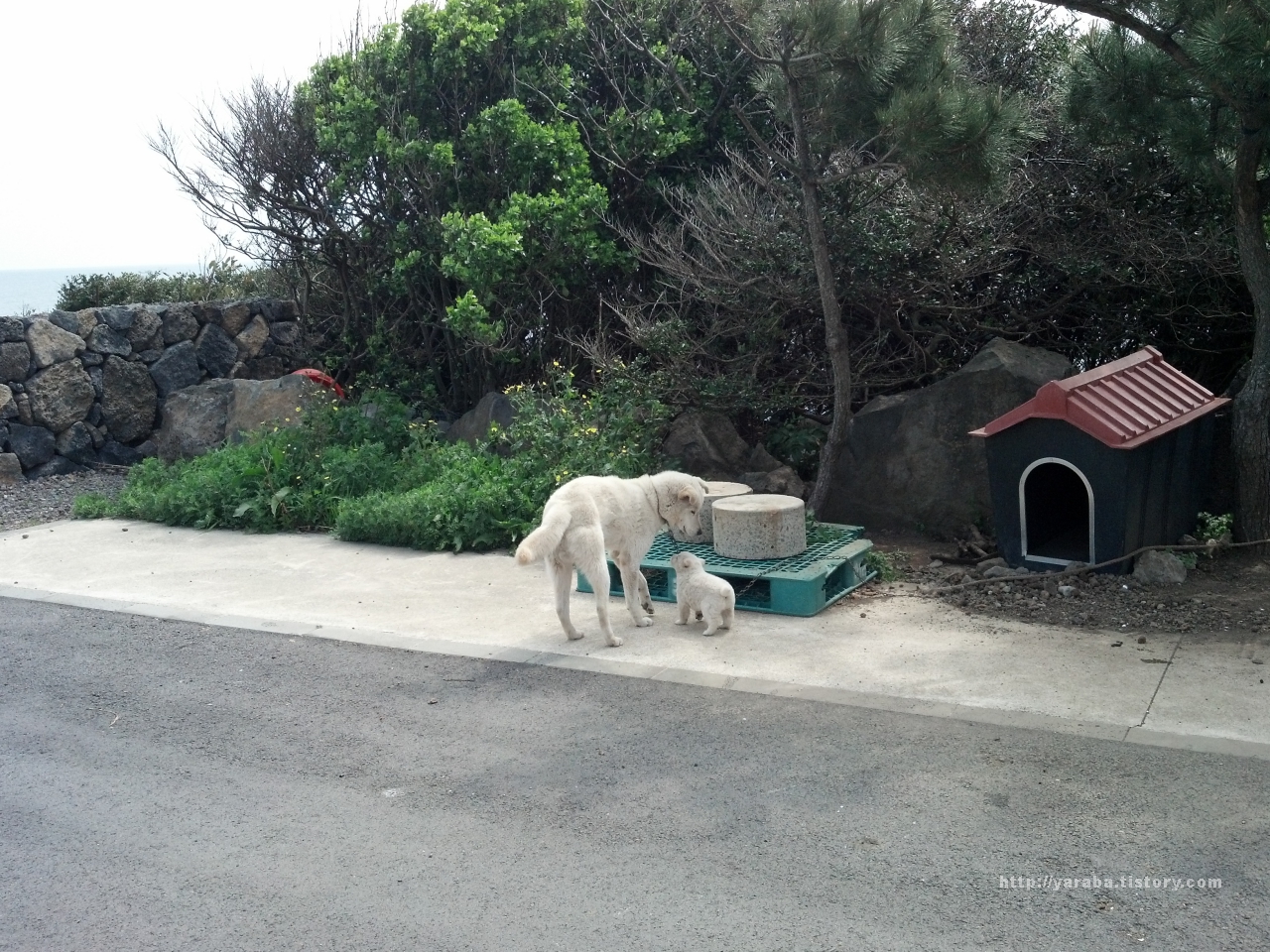 신천 목장을 나서며 만난 또 다른 아름다운 풍경. 태어난 지 얼마 되지 않아 보이는 강아지가 아빠 개에게 다가가서 재롱을 부리고 아빠 개는 양육에 서툰지 어쩔 줄 몰라하는 모습입니다.