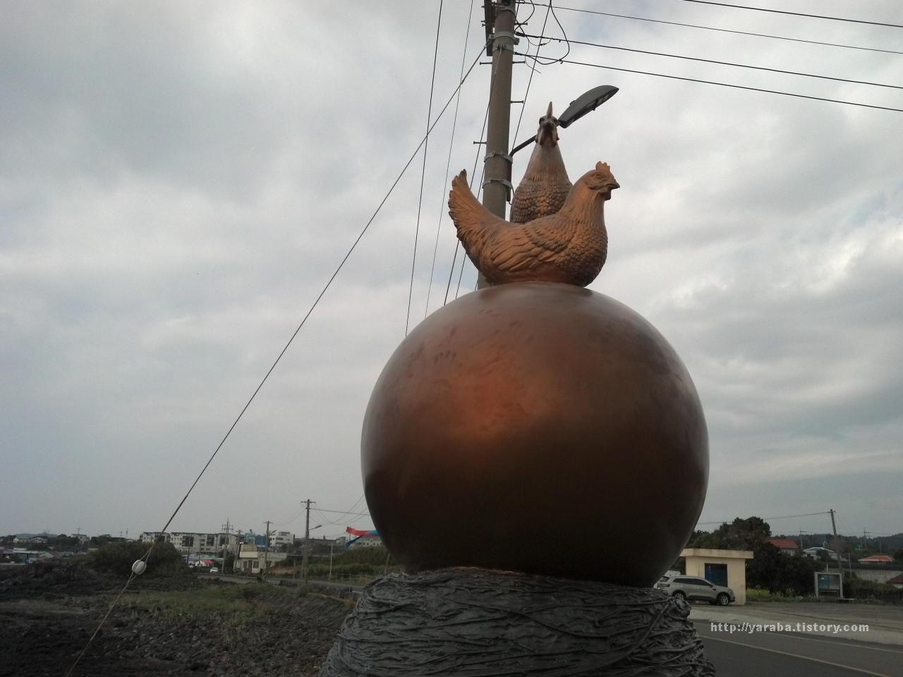 황금닭이 알을 품은 마을 신산리를 표현하고 있는 커다란 조각상. 풍수지리에서 '황금닭이 알을 품은 형국'이란 의미의 금계포란형(金鷄抱卵形)을 말하고 싶은 것인지는 알 수 없지만 멀리서 마을을 바라보면 포근한 삼태기 형태를 이루고 있다고 합니다.