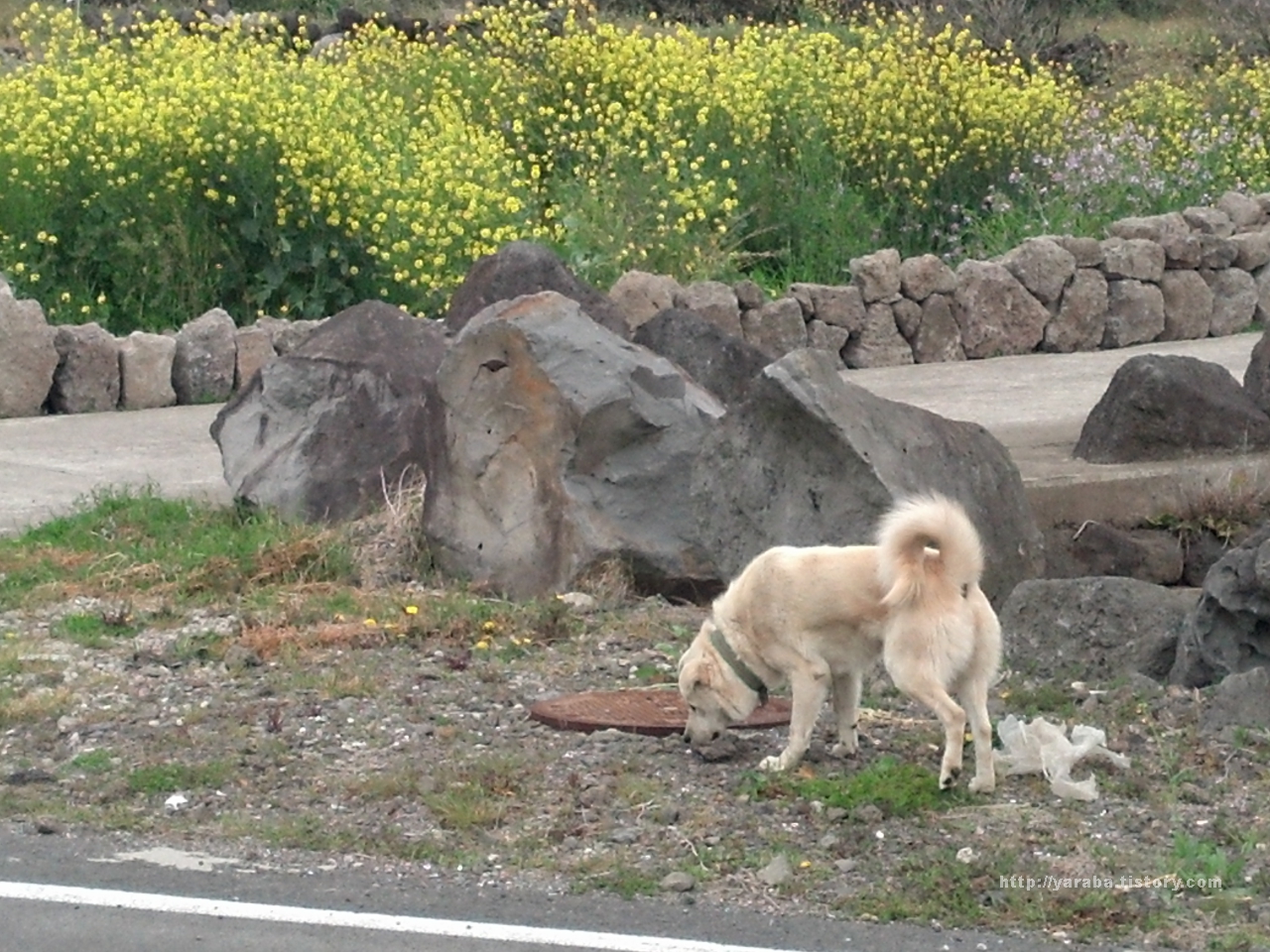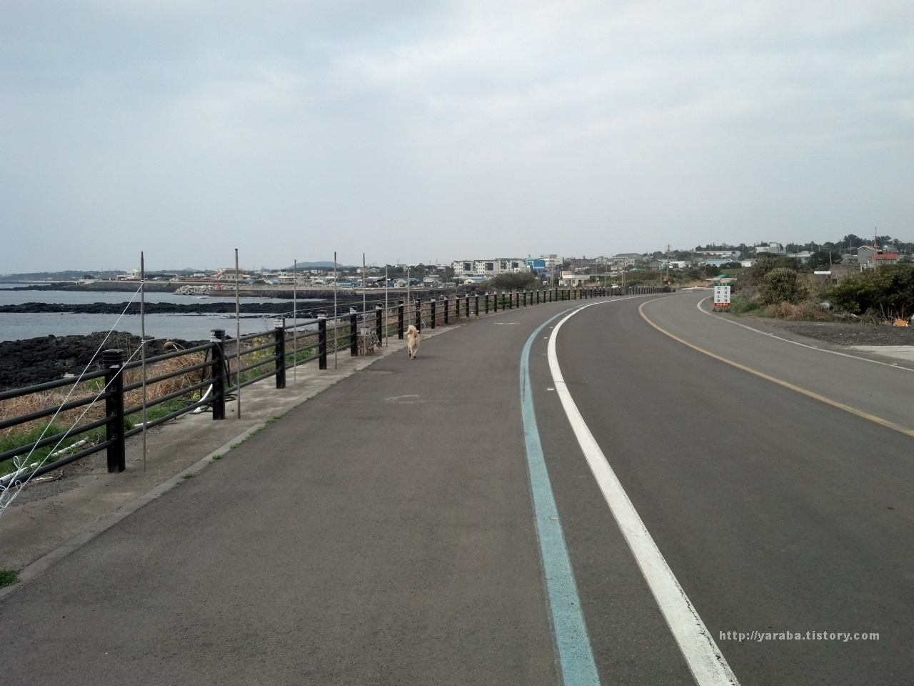 한동안 환해장성로를 걷는데 갑자기 커다란 개 한 마리가 저희에게 다가왔습니다. 그것도 꼬리를 흔들며 친근감을 표시하는 것이 아니라 조금은 위압감을 풍기며 천천히 다가왔습니다. 목줄 없는 커다란 개가 다가오자 저는 집에 있는 개에게 하듯이 손바닥을 내보이며 "안돼! 그만!" 했는데 갑자기 옆지기가 "아니야!" 하면서 저를 말렸습니다. 개가 눈에 흰자위를 보이며 위험한 상황임을 직감했던 거죠. 옆지기의 안내에 따라 조용히 무시하듯 천천히 걸어가니 개가 자기 갈길을 가기 시작했습니다. 묵줄 없는 개가 달려들기라도 하면...... 정말 아찔한 상황이었죠. 동네 개인지 들개화된 유기견인지 정체를 알 수 없었지만 저희 앞에서 영역 표시를 하며 한참을 앞장서 가더군요. 저희는 조용히 개의 눈치를 보면서 따라갈 수밖에 없었고요. 이렇게 올레길에서 목줄 없는 개를 만나게 되면 소리를 치거나 등을 보이며 달리거나 빨리 걷으면 안 되고 시선을 옆으로 돌리고 눈을 깜박이는 것이 개에게 공격 의사가 없고 화해한다는 의미라고 합니다. 눈을 마주 보지 말고 먼산이나 땅을 보며 최대한 자연스럽게 천천히 발걸음을 옮기면 됩니다.