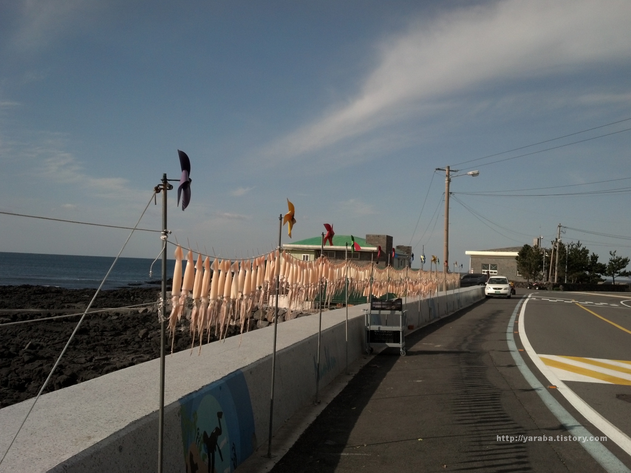 올레길에서 가끔씩 만나게 되는 오징어 건조 풍경입니다. 건조대 기둥에 바람개비도 달아 놓으셨네요. 이른 아침이지만 오늘은 왠지 군것질이 하고 싶었습니다. 만원에 두 마리 하는 반건조 오징어를 사서 아름다운 풍경을 보면 질겅질겅 오물거리며 올레길을 걷는 호사를 누려 보기로 했습니다.