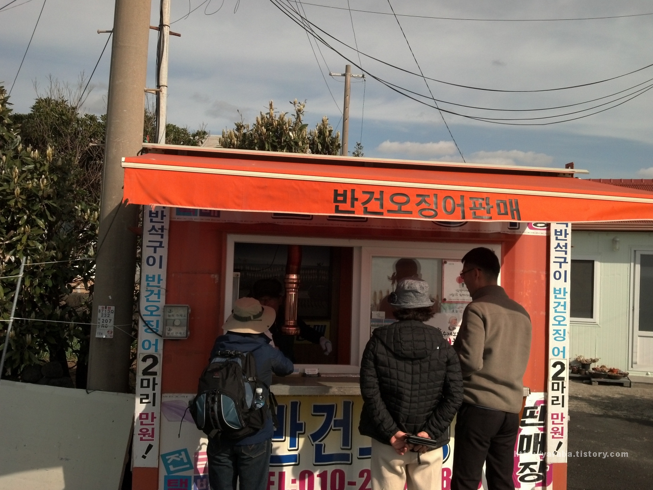 사장님께서는 오징어를 구워 주시면서 큰엉도 좋고 쇠소깍도 좋다며 가는 길에 자신이 찾아 놓은 맛집들이 있으니 명함을 찍어 가라고 하셨습니다. 저희야 도시락을 챙겨 다니는 사람들이니 맛집 탐방할 일이 거의 없기는 하지만 꼼꼼하게 배려해 주시는 사장님의 마음이 고마웠습니다. 위의 사진은 사장님이 가게 앞에 붙여 놓으신 근처 맛집 들의 명함들입니다.