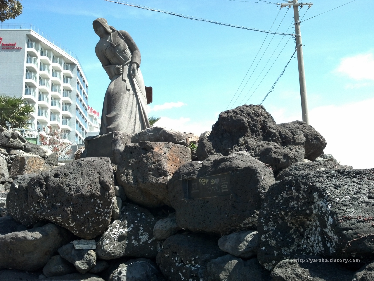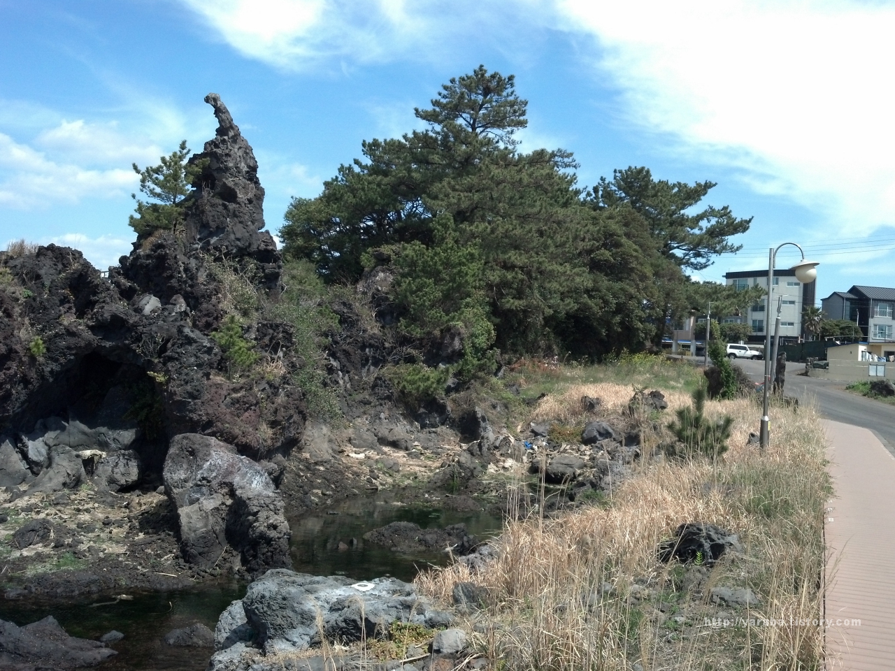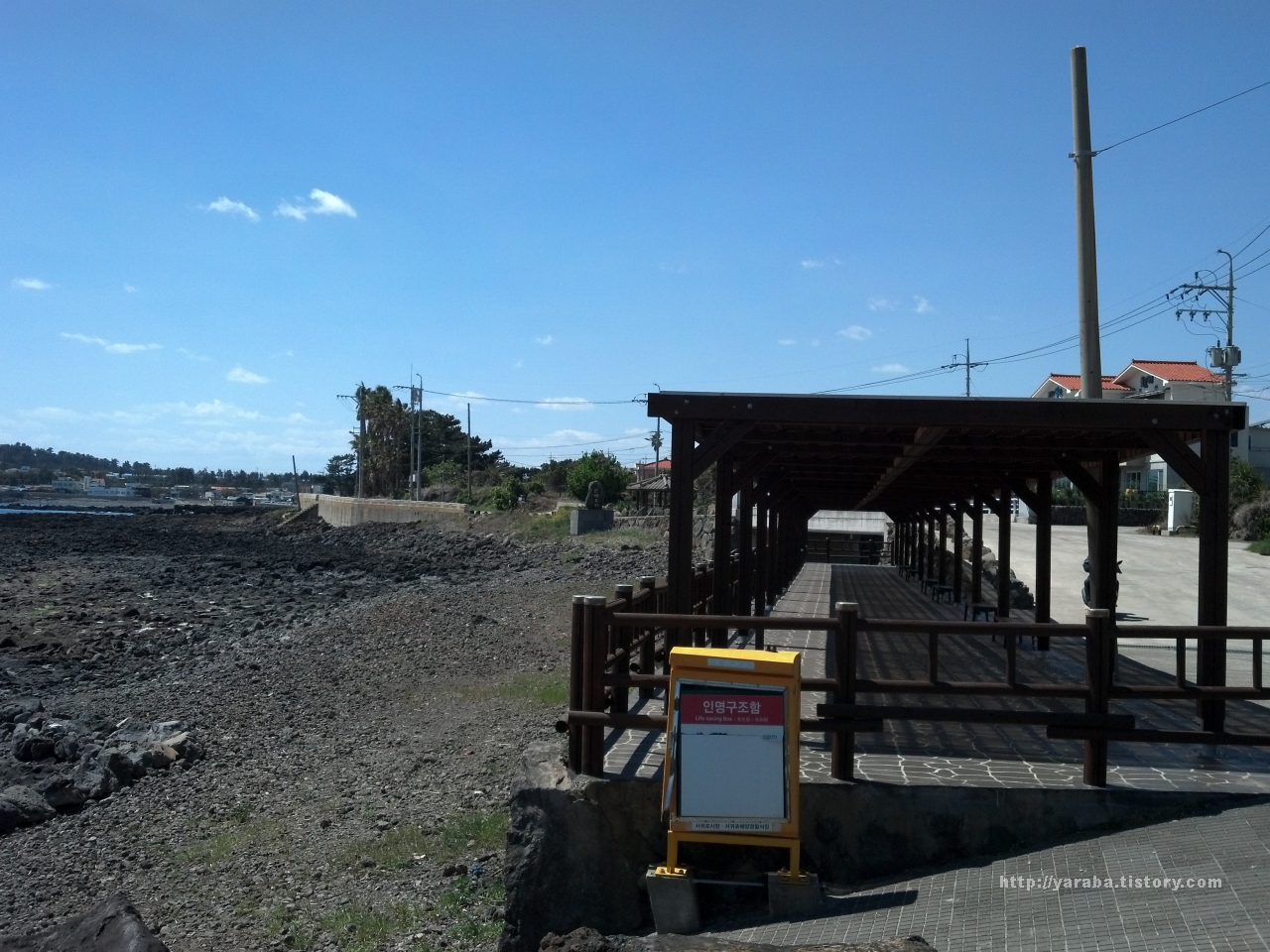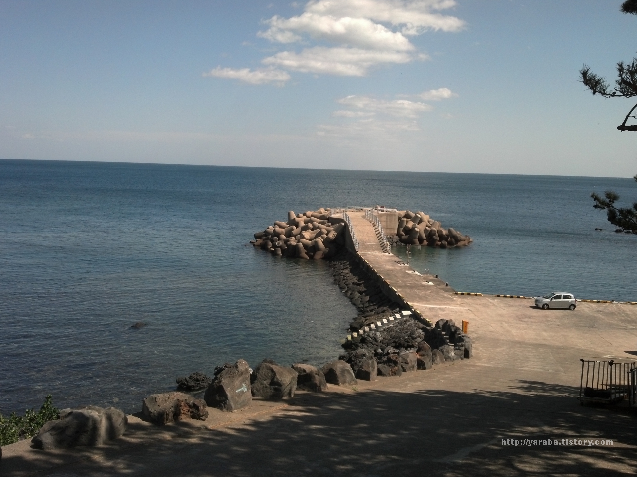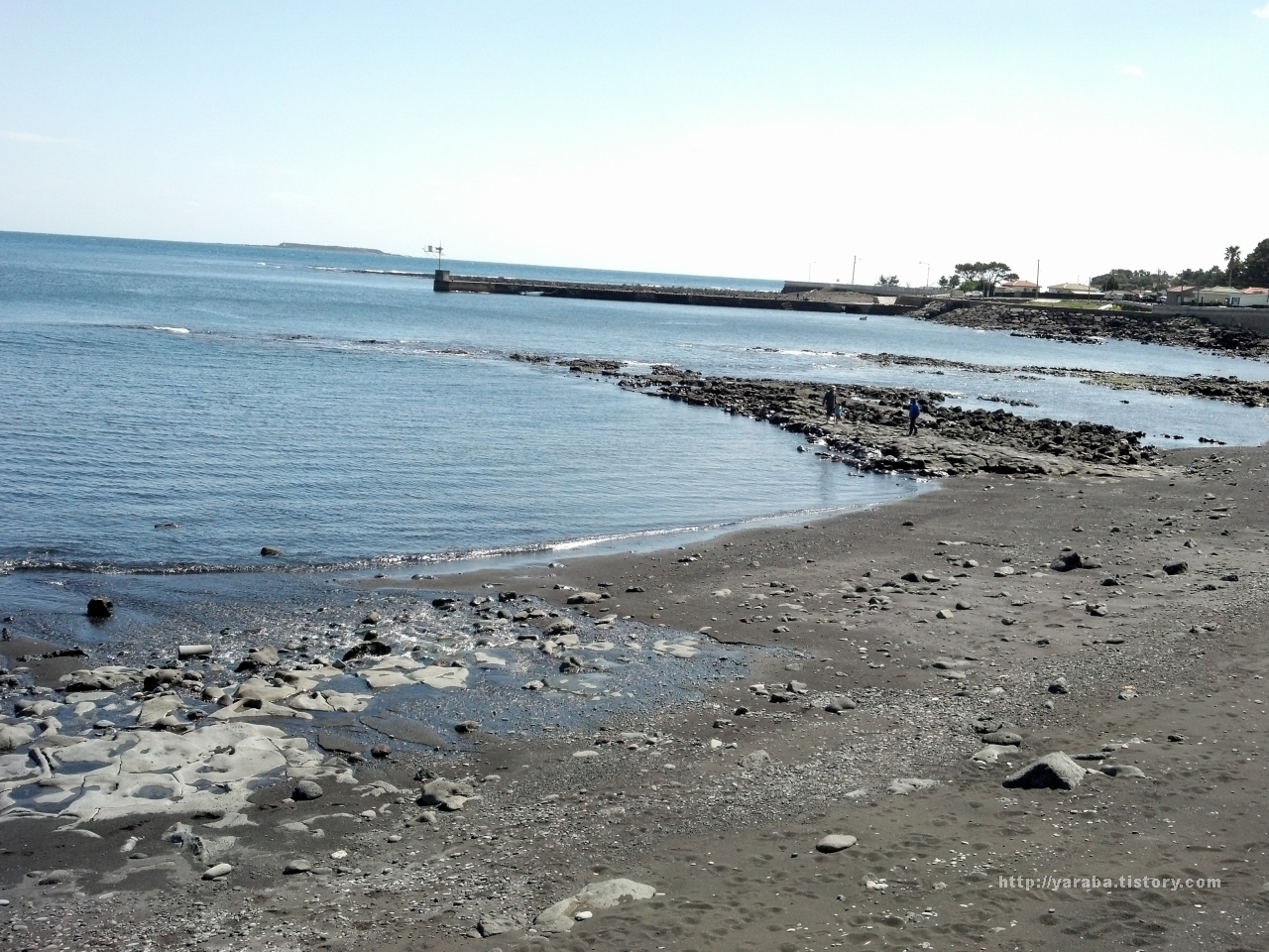 공천포는 한때 삼양 검은 모래 해변처럼 검은 모래로 찜질하려는 사람들이 몰리던 공천포 해수욕장으로 유명했다고 합니다. 그렇지만 지금은 검은 모래를 건축 자재로 사용하거나 방파제 건설, 해안도로 건설 등 여러 요인에 의해 모래가 조금씩 유실되어서 마치 자갈밭처럼 보입니다.