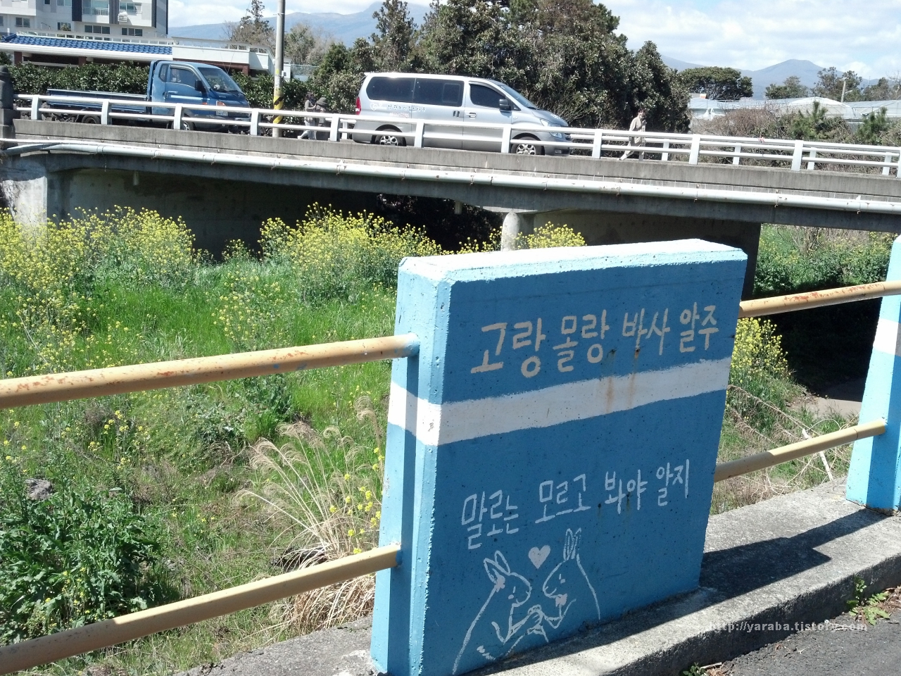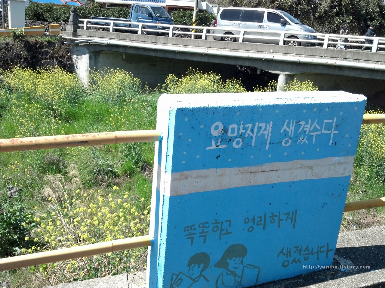 위미 해안로를 따라 걸으면 대서교 라는 다리를 지나서 마을길을 걷는데 다리를 건너기 전에 난간에 새겨진 그림과 글들이 미소를 짓게 합니다.