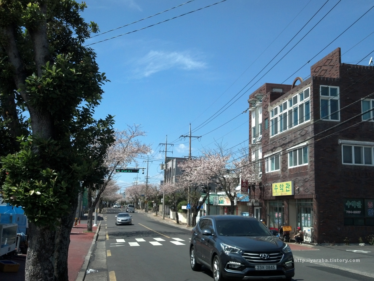위미 우체국 앞을 지나는 위미리의 2차선 도로의 이름은 태위로인데 이 길은 제주에서 벚꽃을 볼 수 있는 대표적인 길 중에 하나입니다.