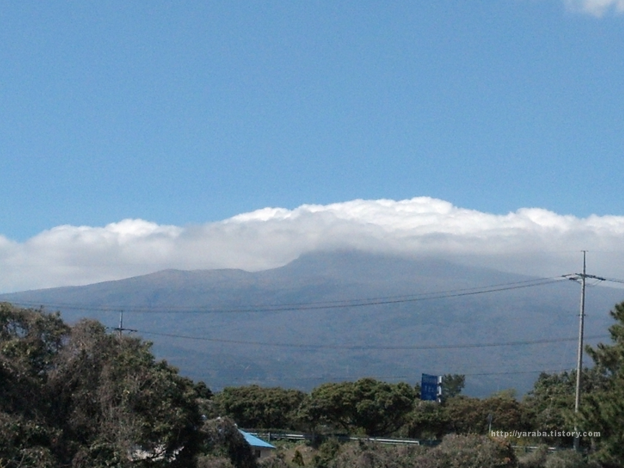 다리에서 바라본 구름 낀 한라산의 모습입니다.