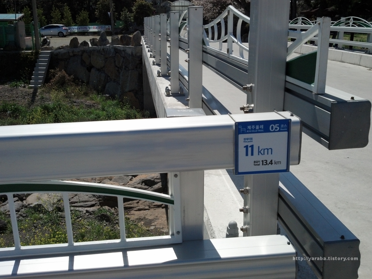개천을 건너 길을 이어 갑니다. 물이 흐르던 때가 오래되었었는지 개천 바닥에는 유채꽃이 피어 있습니다. 개천을 건너지 않으면 앞에 보이는 다리를 거쳐서 돌아가야 합니다.
