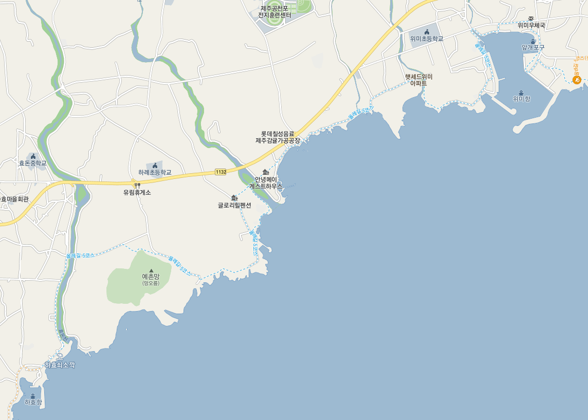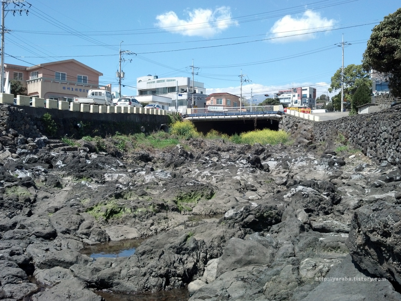 올레길은 벚꽃이 활짝 핀 태위로에서 다시 해안가로 들어오는데 걷다 보면 고망물을 만납니다. 올레길은 태위로까지 나가서 돌아오는 길이지만 개천의 수량이 없는 때이니 만큼 고망물을 지나서 개천을 가로지르기로 했습니다.
