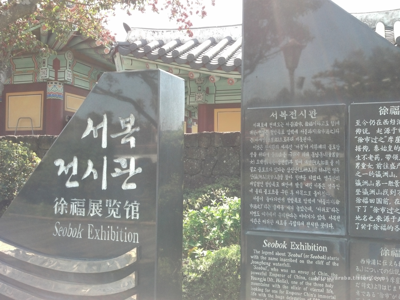 전설에 의하면 서복이 제주를 떠나면서 정방폭포 암벽에 서불과지(徐不過之)라 적어 놓았다는데 실제 흔적은 없다고 합니다. 현재는 서귀포시에서 새겨 놓은 서불과차(徐不過此)라는 글씨가 있다고 합니다. "서복이 다녀갔다"라는 의미라고 합니다. 서귀포라는 지명이 이 말에서 유래했다는 점이 주의를 끄네요.