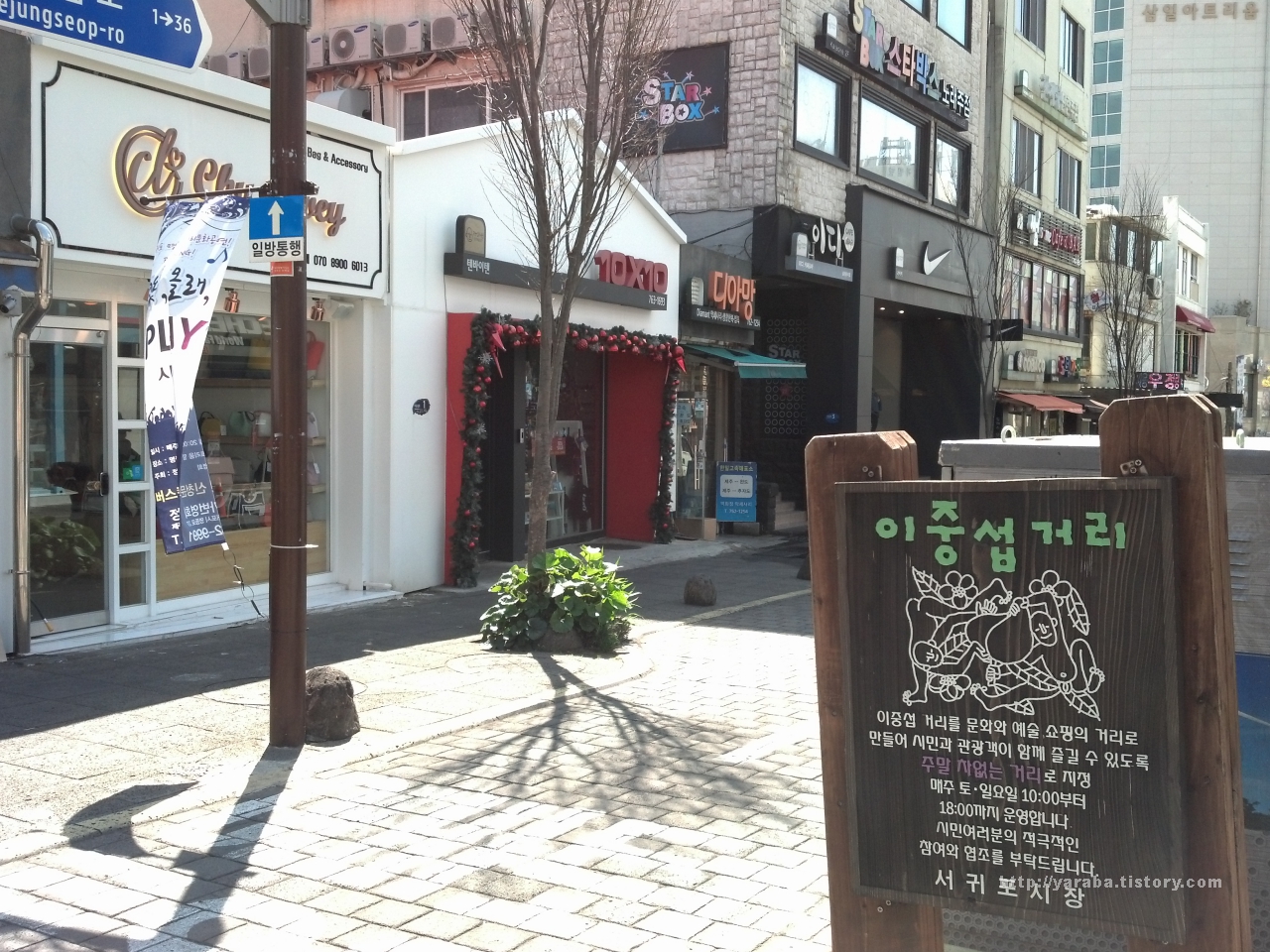 올레 시장 입구에서 우회전하면 바로 이중섭거리가 시작합니다. 올레 시장과 이중섭 거리로 이어지는 이곳은 제주 서귀포를 찾는 사람들에게는 필수 코스라지요! 가로등이며 바닥 블록까지 모두 이중섭의 그림을 소재로 한 독특한 거리입니다.