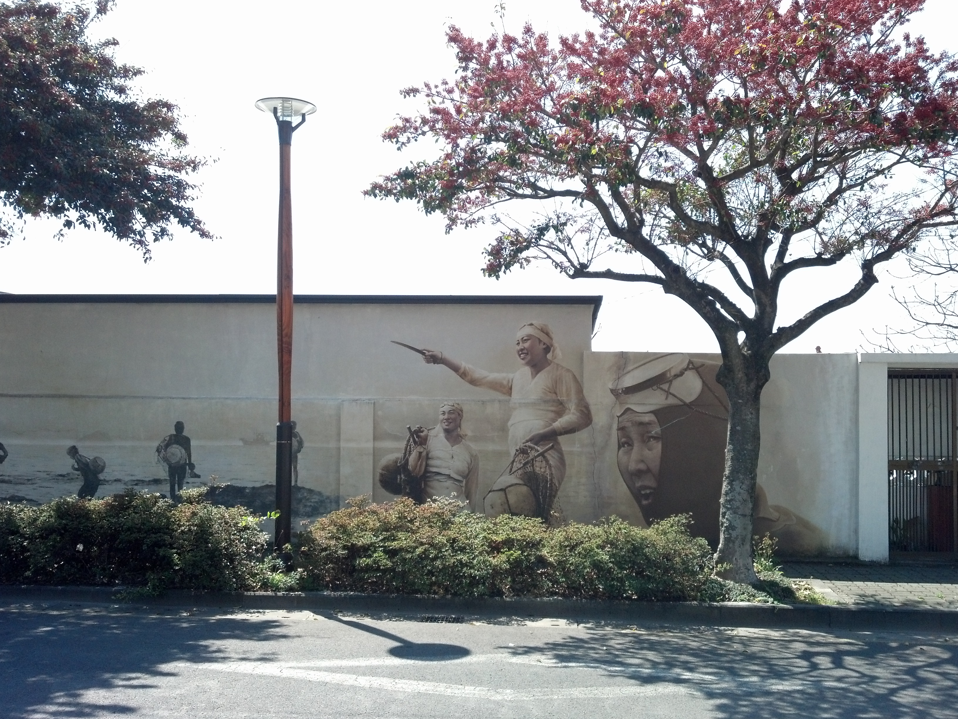 소암 기념관에 전시된 서예 작품들을 볼 수 있었으면 더 좋았을 텐데 하는 아쉬움이 있었지만 그 아쉬움을 달래 주는 그림이 기념관 앞쪽의 벽화에 있었습니다. 동피랑 마을의 벽화나 수많은 동네의 벽화들을 만났었지만 이 길의 해녀 그림은 정말 엄지 척할 만큼 생동감이 살아 있는 작품이었습니다. 거의 미술관에 걸린 만한 수준의 작품을 거리의 벽화에서 만나다니 이 그림을 그린 화가에게 감사의 인사를 건네고 싶었습니다.