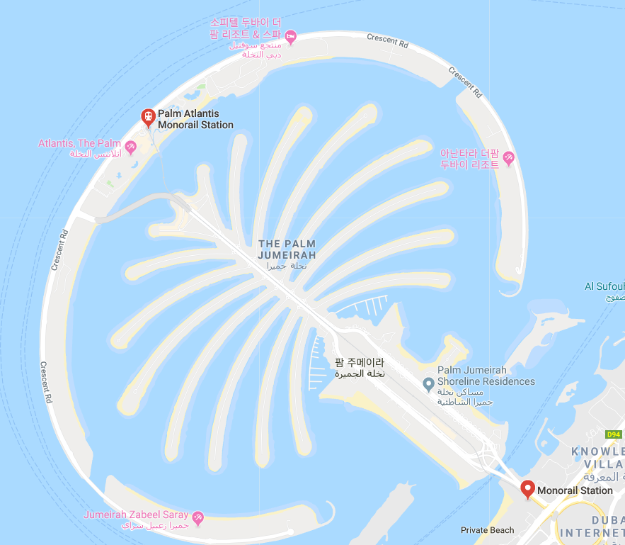 팜 주메이라 섬은 위의 지도처럼 하늘에서 보면 야자수 모양입니다. 모노레일로 섬을 횡단하여 섬을 구경하면서 아틀란티스 더 팜 호텔을 다녀옵니다. 모노레일 역에 도착하면 1일권은 사용할 수 없기 때문에 1인당 30 AED로 왕복 티켓(return ticket)을 구매하여 5.4Km에 달하는 섬 끝까지 이동합니다. 모노레일은 11분이 걸려 아틀란티스 더 팜 호텔에 도착합니다. 아틀란티스 더 팜 호텔의 상점과 해변 등 개방된 공간을 다녀옵니다. 아쿠아리움과 워터파크는 호텔 숙박자는 무료이지만 그렇지 않으면 비용을 지불해야 합니다.