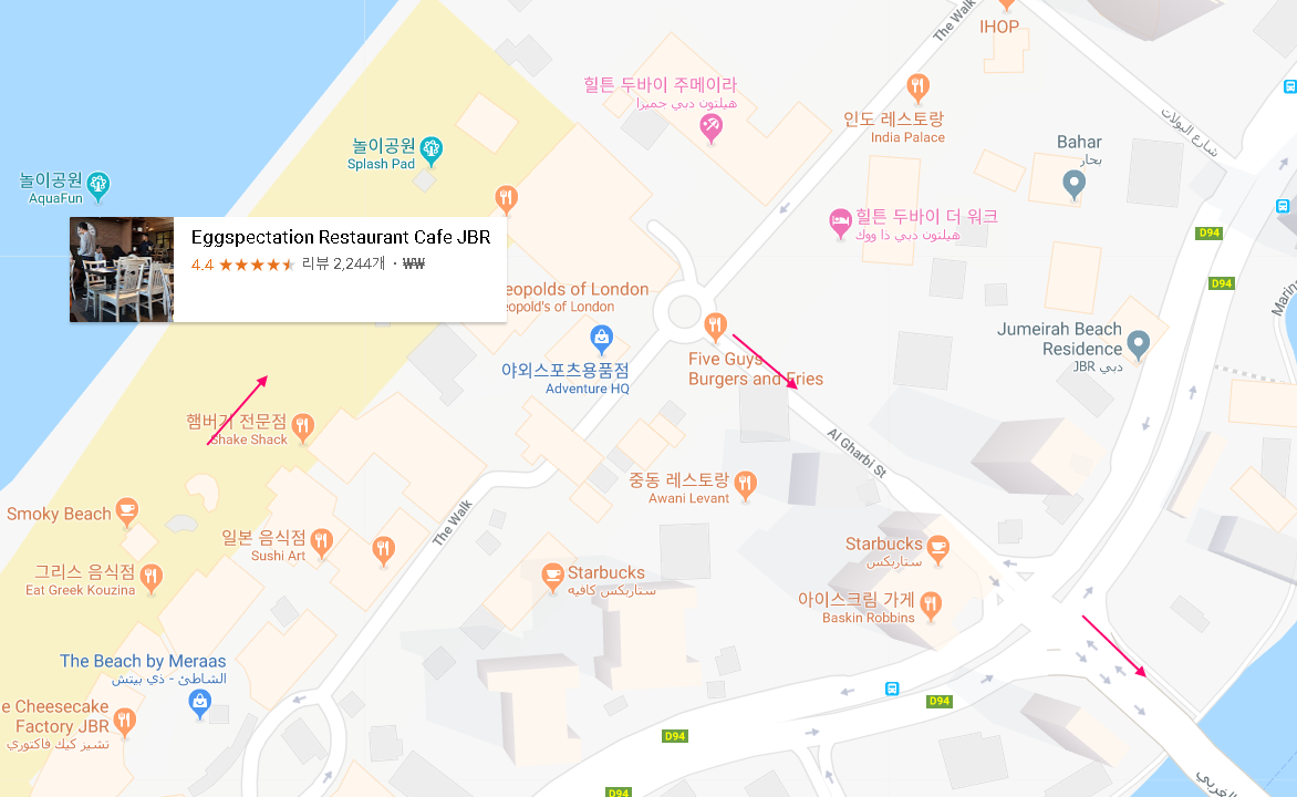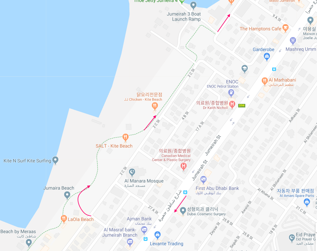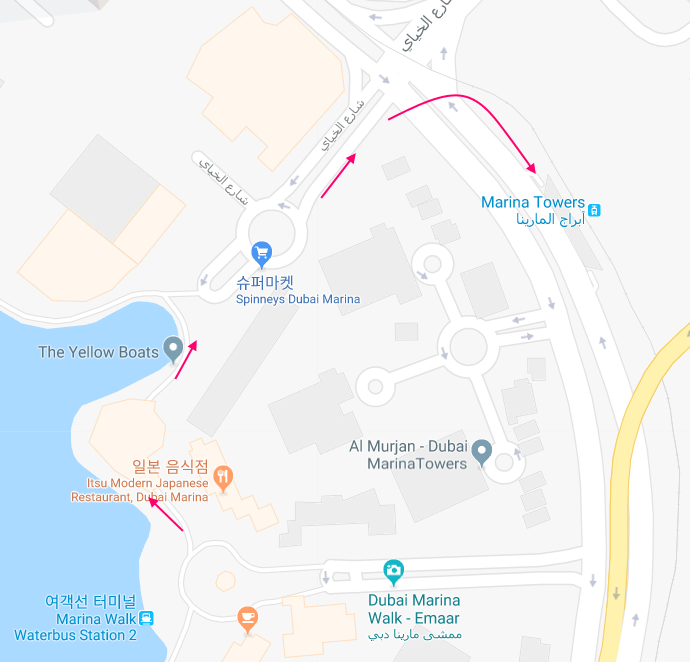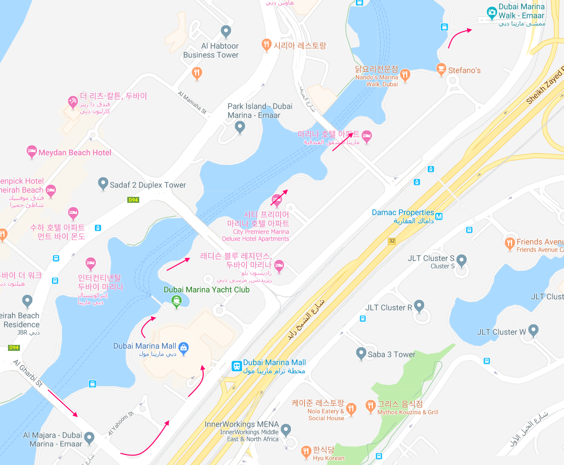 힐튼 호텔 근처까지 1.5Km 내외를 걸을 것으로 보입니다. 아침 시간이니 만큼 걷다가 브런치를 즐길만한 장소도 골라 두었습니다. 가격은 결코 싸지 않습니다. 시장기가 있다면 JBR 비치에서 브런치를 하고, 아니라면 마리나 몰의 푸드 코트에서 브런치를 해도 좋을것 같습니다. JBR지역 걷기가 끝나면 알 가르비 거리(Al Gharbi St.)를 따라 다리를 건너서 마리나 몰로 향합니다.