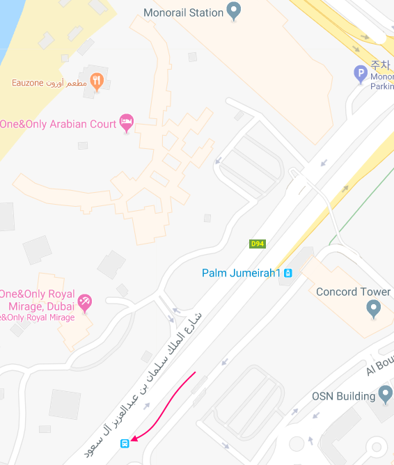 리턴 표를 끊어 팜 주메이라 섬(The Palm Jumeirah)을 다녀오면 아까 내린 트램 정류장 쪽으로 걸어서 "로열 미라지 호텔 2, Royal Mirage Hotel 2" 버스 정류장에서 8번이나 N55번 버스를 타고 북쪽으로 9분(8개 정류장) 거리에 있는 "버즈 알 아랍 호텔 2, Burj Al Arab Hotel 2" 정류장에 내립니다.