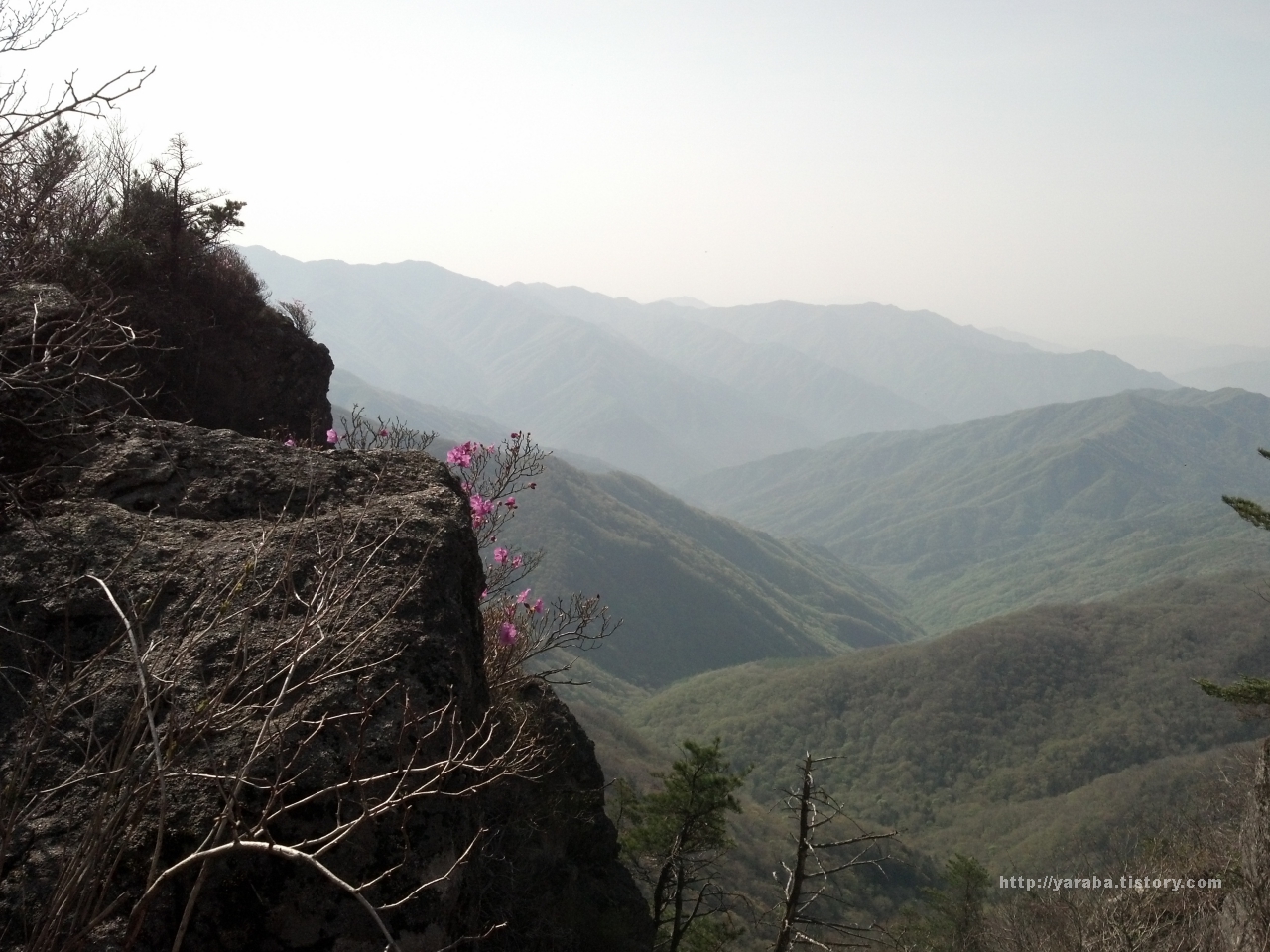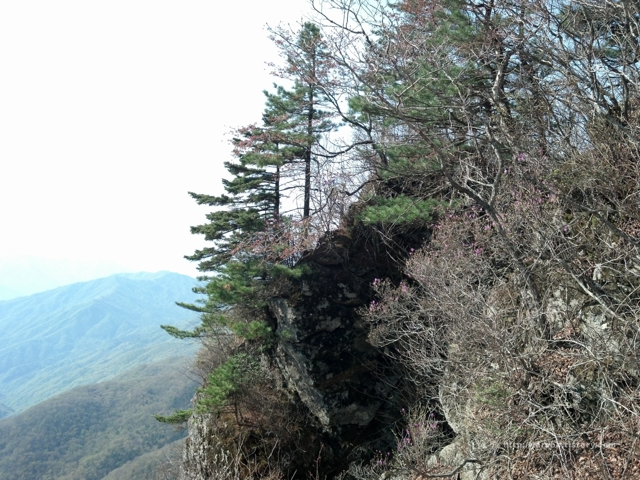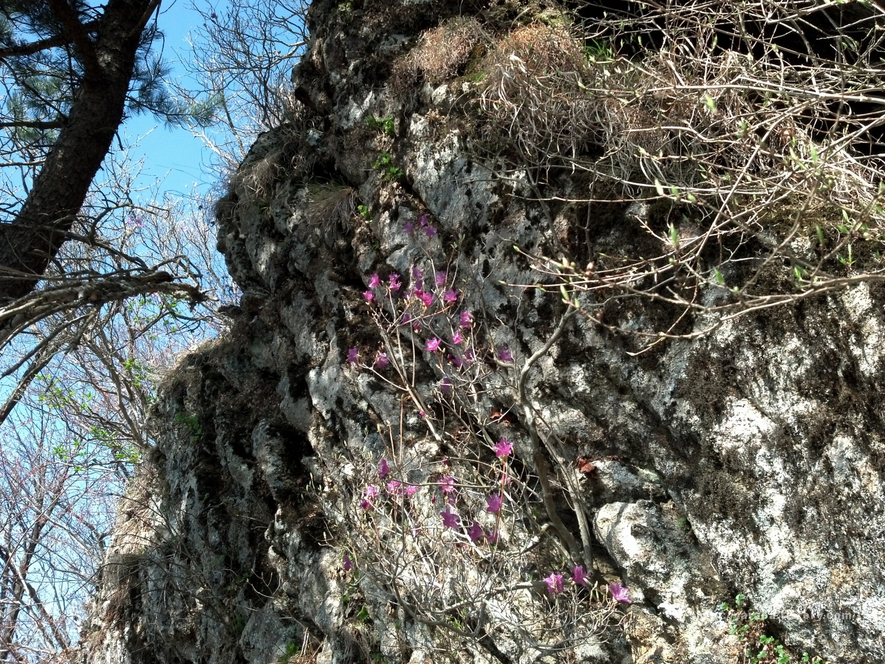 커다란 바위에 아슬아슬하게 뿌리를 내린 진달래도 꽃을 피운 지금 한 폭의 산수화의 주인공이 됩니다.