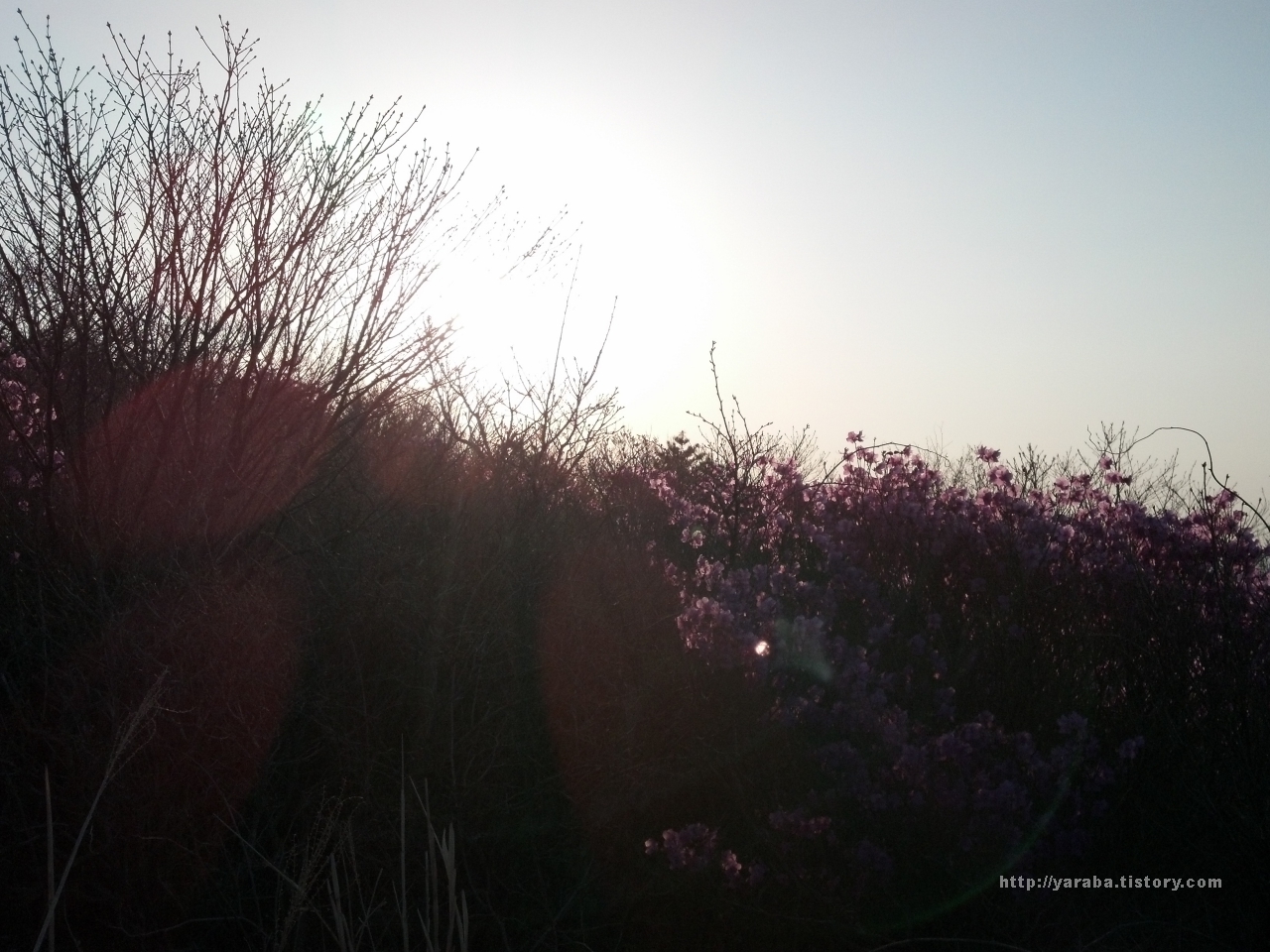 아침 햇살을 정면으로 받고 있는 진달래. 분홍빛에 붉은 태양빛이 더해진 빛깔입니다.