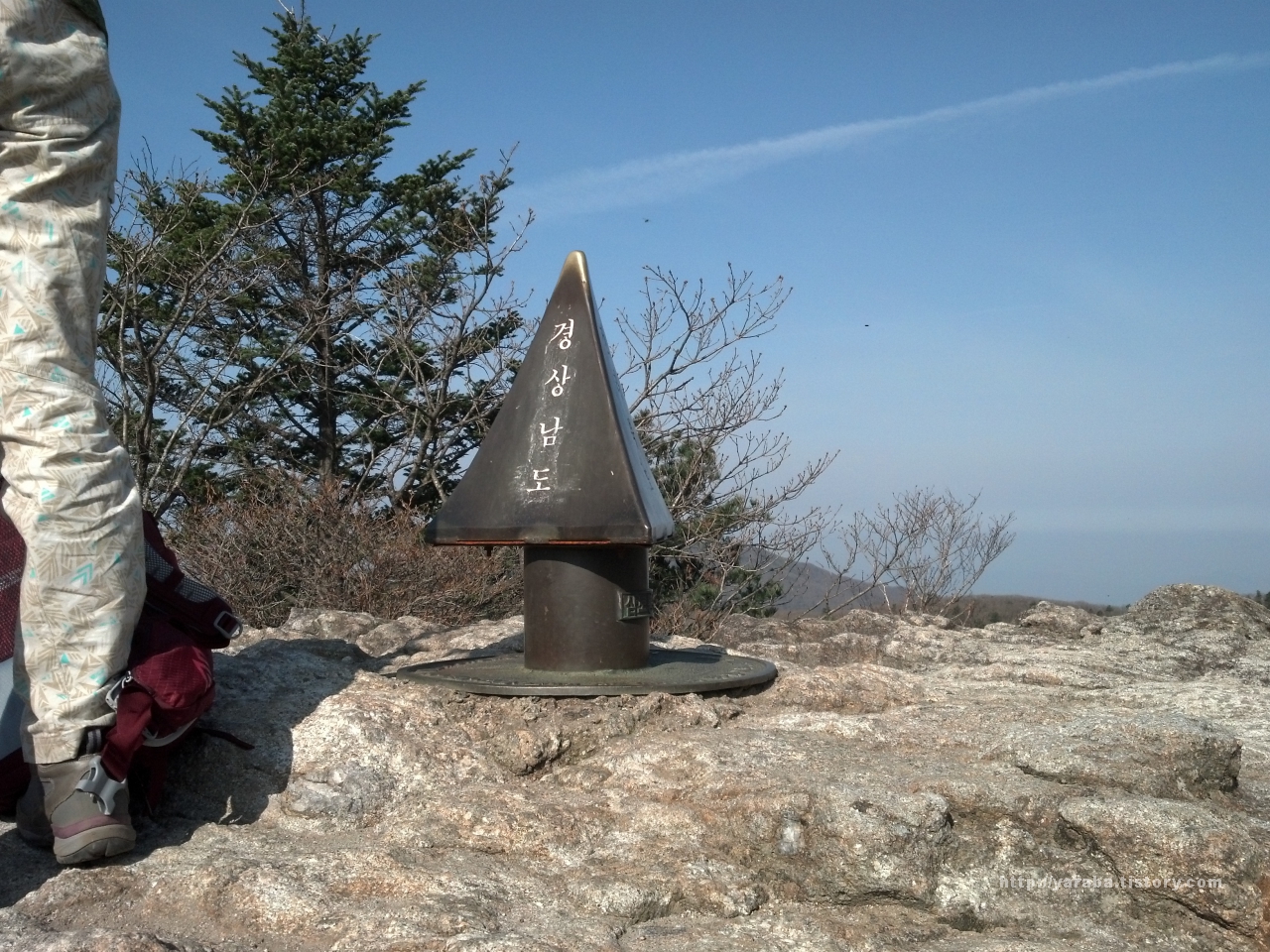 전라남도, 전라북도, 경상남도의 경계면이 만나는 곳인 삼도봉에 도착했습니다. 삼도를 상징하는 삼각 철제 구조물이 이곳이 삼도의 경계선임을 나타내 줍니다.