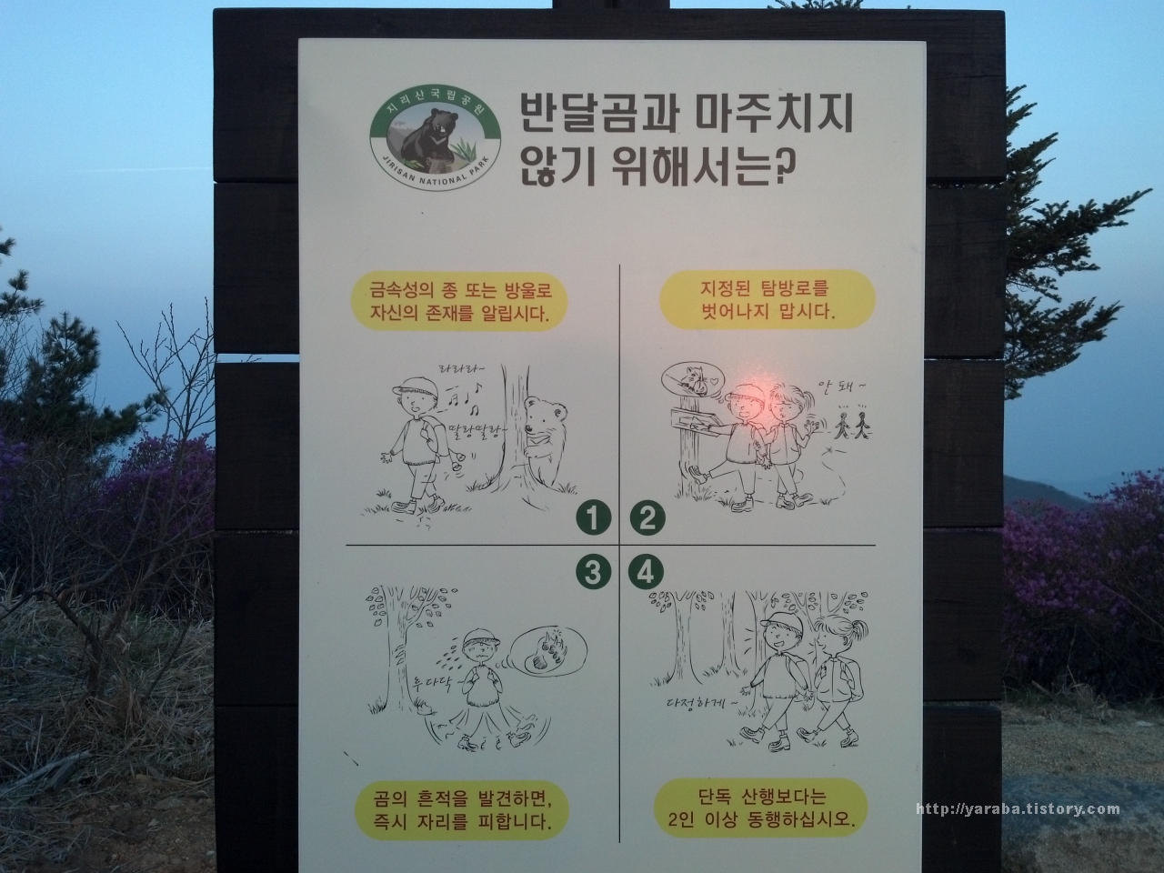 어릴 적 지리산을 다닐 때는 전혀 만날 수 없었던 표지판. "반달곰과 마주치지 않기 위해서는?"이라는 안내판입니다. 평소 반달곰에 대한 다큐멘터리를 관심 있게 본 사람이라는 혹여 등산 중에 곰을 마주치지는 않을까? 하는 염려가 있는 것도 사실입니다. 그렇지만, 몇 가지 주의 사항만 주지하고 있으면 큰 문제가 없어 보입니다. 제일 중요한 것이 탐방로를 유지하고 뒤를 보이고 도망하지 말며, 금속성을 내는 호루라기 하나는 준비하면 좋겠다 싶었습니다.