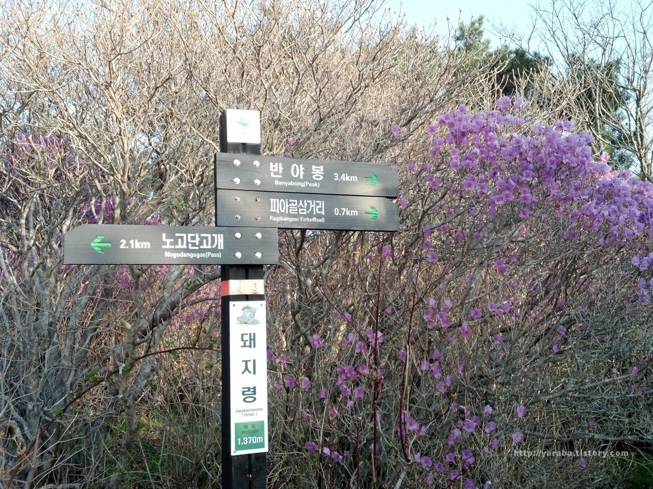 돼지령(1,370m). 부근에 멧돼지가 자주 출몰한다는 돼지평전이 있어 붙여진 이름인데 돼지 평전에는 멧돼지들이 좋아한다는 둥굴레가 많이 서식한다고 합니다. 돼지령을 "비목령"이라고도 부르는데 바로 무명용사를 기리는 가곡 비목(碑木)의 주인공은 아니고 1970년 산행을 하다 동사한 고교생 3명을 기리는 비목이 세워져 있던 곳이라 합니다. 노고단에서는 멀지 않지만 천왕봉 쪽에서 노고단으로 향하는 산행을 하는 경우 이곳이 탈진 조난 사고가 빈번한 고비라 합니다.
