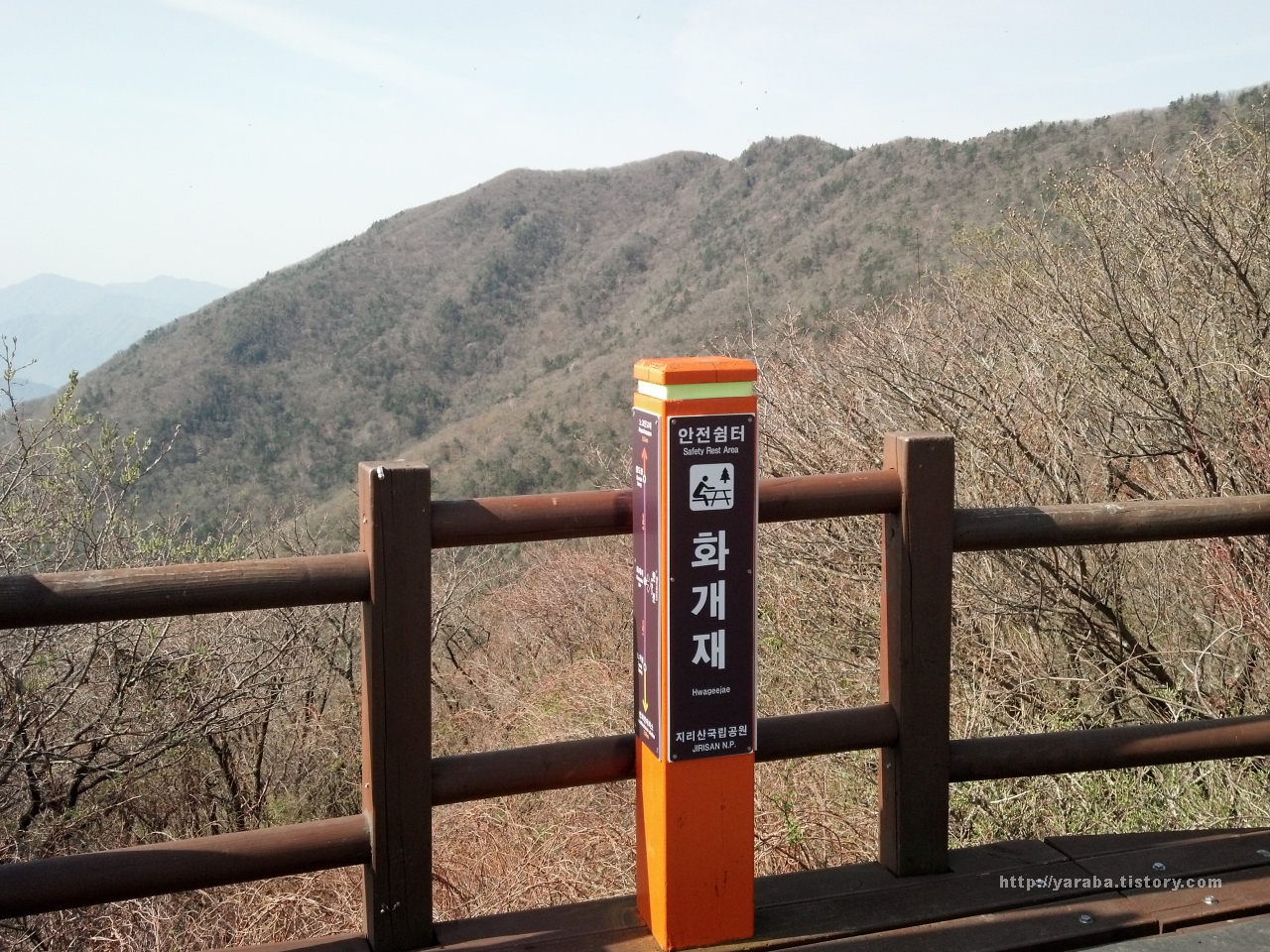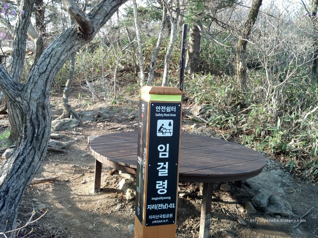 화개재에 만난 안전 쉼터. 배낭 걸이와 벤치까지 쉬어가기에는 너무 좋은 공간입니다. 화개재는 뱀사골 코스와 이어지는 장소로 예전에는 뱀사골 쪽의 남원 산내 장터의 상인들과 하동 쪽의 화개장터 상인들이 물물교환을 하던 고개라 합니다. 노고단 고개에서 3시간 정도 걸렸는데 저질 체력의 거북이 산행치고는 준수하게 산행했습니다.