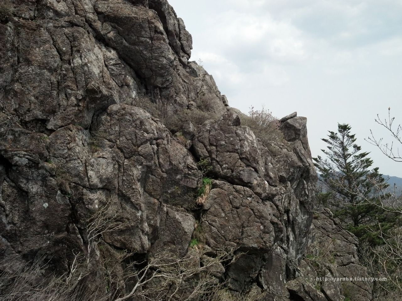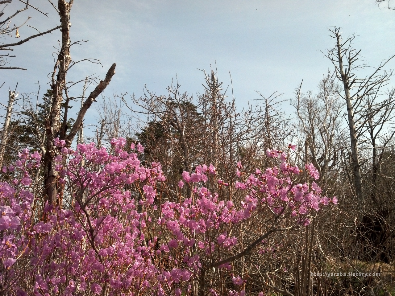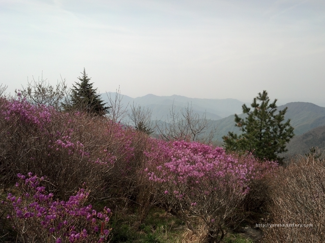 한 겨울 세찬 눈보라가 지나가면 환상적인 눈꽃 절경을 선사해주던 구상나무 고목을 배경으로 토끼봉의 진달래 군락지가 시작되었습니다.