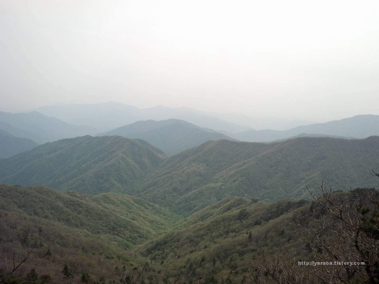 녹음이 서서히 올라오고 있는 산의 능선들.