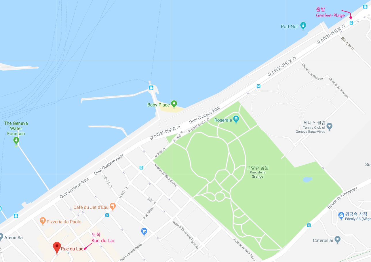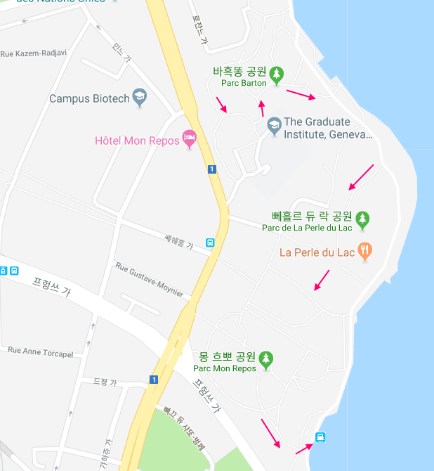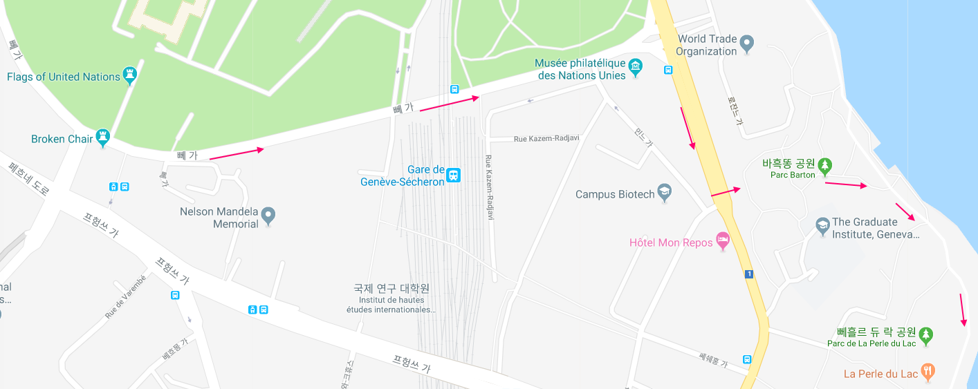 유엔 본부 쪽으로는 보안 때문에 들어갈 수 없으므로 유엔본부를 감싸고도는 빼가(Avenue de la Paix)를 따라서 레만 호수 쪽으로 걷습니다. 호수 옆으로 이어진 아름다운 공원들을 지나 레만호를 건널 수 있는 보트 정류장까지 걷습니다. 2Km 내외의 거리입니다.