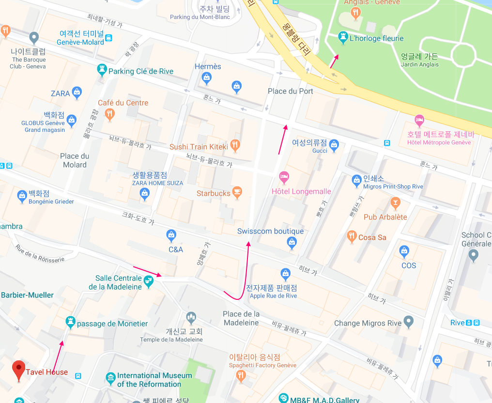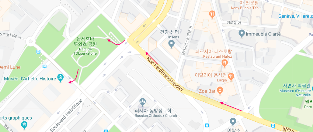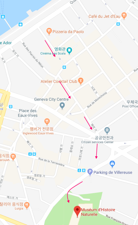 제네바 분수 관람이 끝나면 근처 슈퍼인 미그로스(Migros)에 들러 식수와 간식거리, 브런치 및 점심거리를 구매합니다. 카드로 결제하면 셀프 결제도 가능하지만 현금이면 계산원에게 가야 한답니다. 먹을거리가 충전이 되었으면 위의 지도처럼 도심을 가로질러 자연사 박물관으로 향합니다.