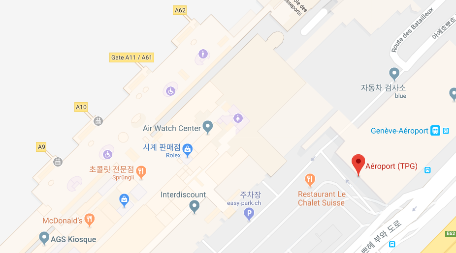 제네바 공항을 나오면 공항버스 정류장(Aéroport -TPG)으로 이동해서 Thônex, Vallard행 5번 버스에 승차하여 일곱 정류장(10분) 이동후 UN 본부(Nations) 정류장에서 하차합니다. 승차권은 80분간 유효한 무료승차권을 이용합니다.