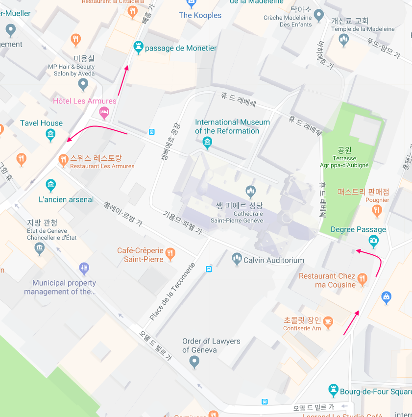 부르 드 푸르 광장으로 돌아오면 "닭의 사다리"란 의미의 작은 통로(Passage des degrés)를 통해서 성당 뒤편으로 이동하여 생 피에르 성당과 종교 개혁 박물관을 차례대로 관람합니다. 제네바의 구 도심을 만나는 시간입니다.