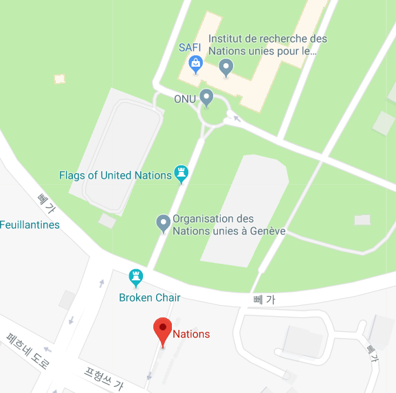 유엔 본부(Palais de Nations) 정류장에서 내리면 거대한 "부러진 의자, Chair du Palais des Nation"라는 조형물을 만나게 됩니다. 노벨 평화상을 공동 수상한 핸디캡 인터내셔널(Handicap International)이란 단체의 의뢰로 스위스의 예술가 다니엘 버셋(Daniel Berset)이 제작한 작품입니다. 무게 5.5 톤, 높이 12미터에 이르는 목조 조형물은 부러진 다리를 통해서 직접적으로는 지뢰에 의해 희생된 많은 민간인들을 기리고 경각심을 갖게 하지만 평화, 인권, 지속가능 발전과 사회적 책임 등 여러 가지로 해석될 수 있습니다.