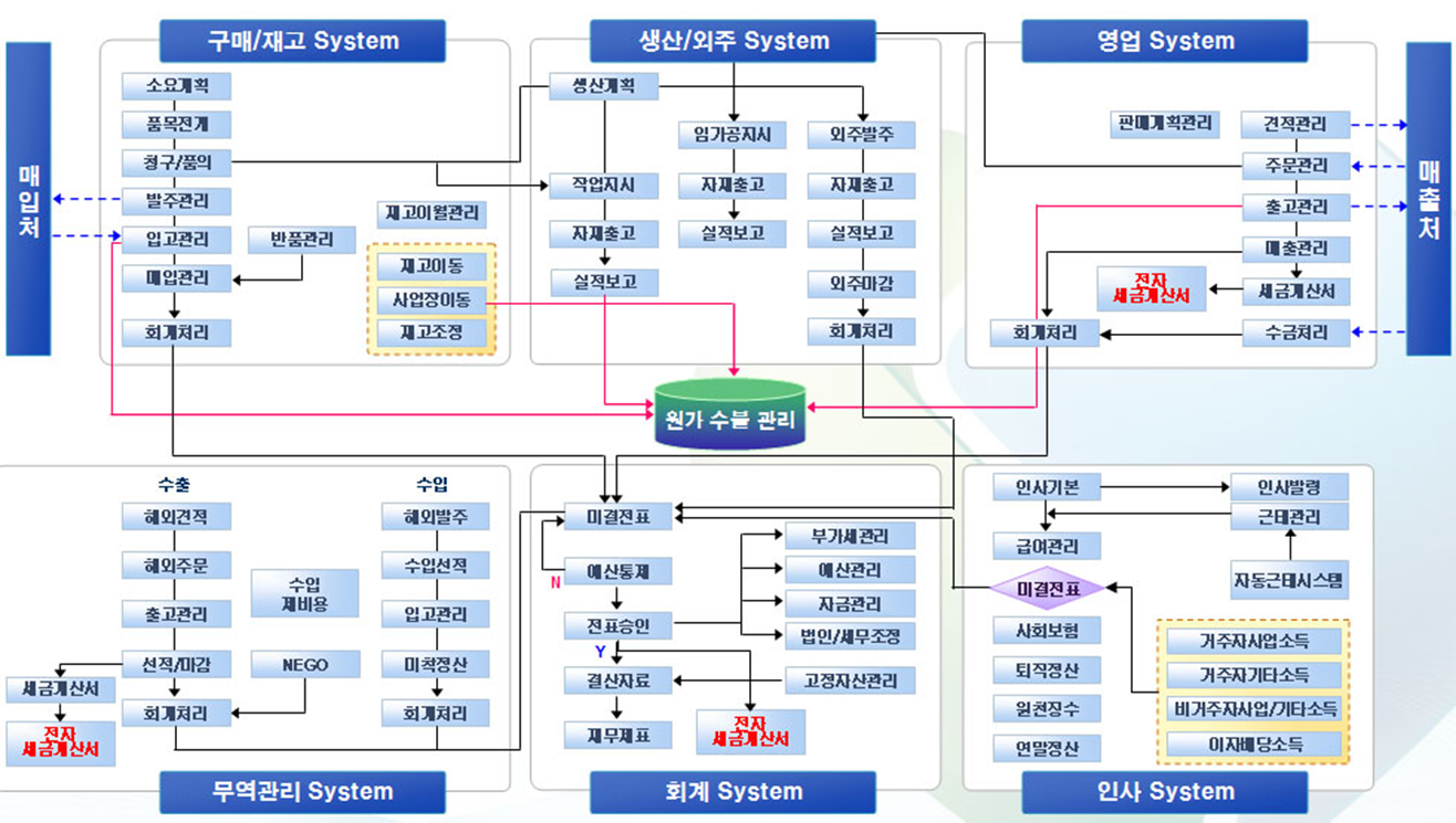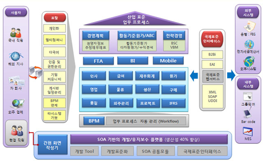 ERP 시스템이 복잡하고 규모가 크다고 해서 패키지 형태의 ERP를 도입하는 방법만 있는 것은 아닙니다. 많은 경우 패키지를 구매하여 자신의 기업에 맞도록 조정하는 형태로 프로젝트가 진행되기도 하지만, 중소 기업의 경우에는 기업의 전산 담당자가 기업에 꼭 필요한 기능만을 직접 개발하는 경우도 있습니다. 그렇지만 두 가지 접근 방법 모두 사용자가 무엇을 필요로 하는지, 기업에 꼭 필요한 기능은 무엇인지를 찾는 작업을 꼭 거쳐야 하고 이 과정이 불완전하다면 해당 ERP 시스템은 조직에 정착하지 못하고 천덕꾸러기 신세를 면하지 못할 것입니다. 또한, 시스템 도입 이후에도 조직의 변화와 시장 환경의 변화 등에 따른 변경 요구, 고비용, 실패 위험, 사용자 불만족 등 개발 및 도입 위험성이 상당한 시스템입니다.