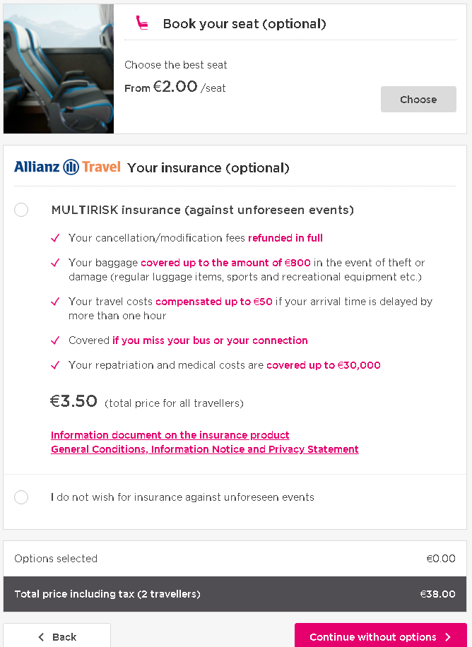 다음 화면은 여행자 보험과 좌석 등급 옵션 선택 화면으로 저희는 옵션 없이 [Continue without options]를 선택했습니다.