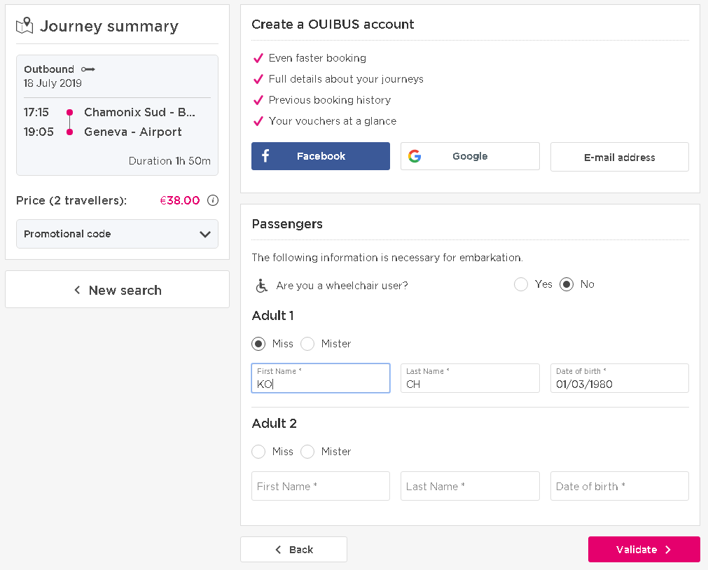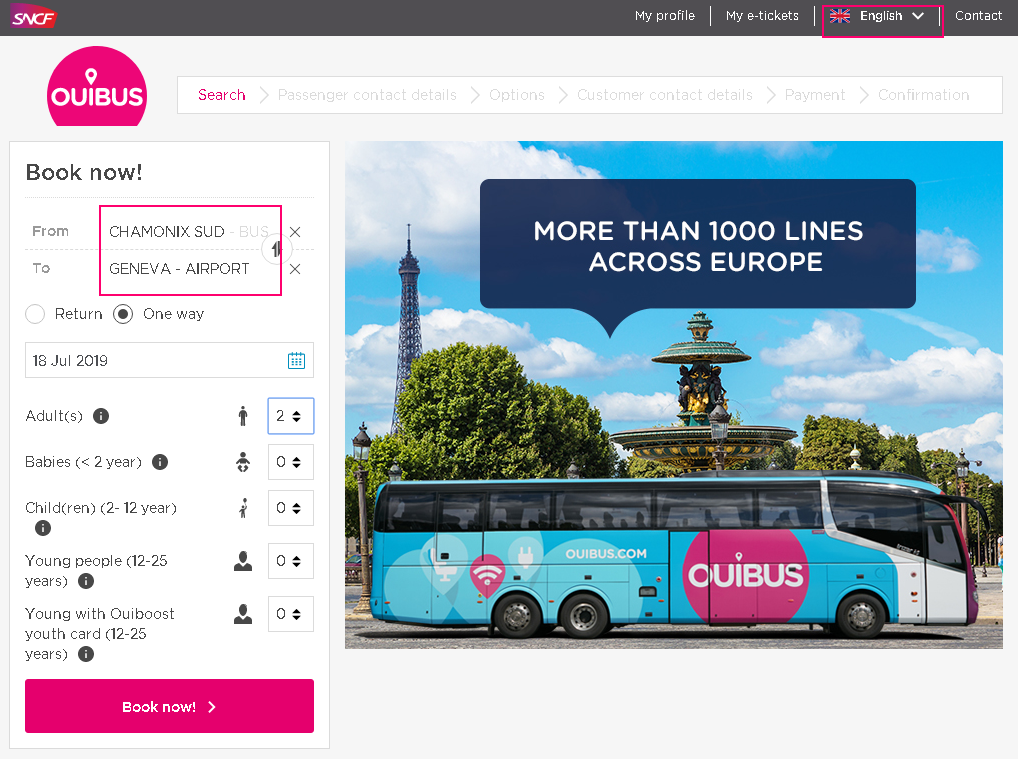 사이트에 들어가면 언어를 영어로 변경하고 출발지를 "Chamonix Sud - Bus station"으로 선택하고 도착지를 "Genève - aéroport"로 선택한 다음 일자와 인원을 선택하고 [Book now!]를 클릭합니다. 위버스(OUIBUS)는 프랑스의 철도회사 SNCF에서 운영하는 버스 회사로 유럽의 많은 도시를 저렴한 가격으로 이동할 수 있는 방법입니다. 야간 버스를 이용하면 영국 런던까지 19유로 이하의 가격으로 이용할 수 있는 티켓을 구할 수도 있습니다.