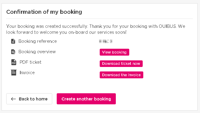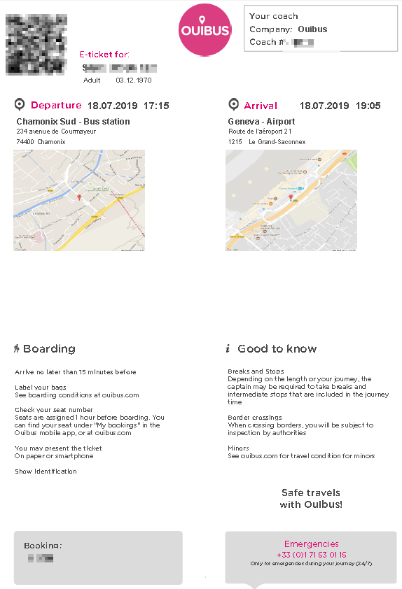 위의 그림은 출발/도착지가 담긴 티켓입니다. 인쇄를 한다면 4 등분해서 접을 수 있도록 했습니다. 정류장에 최소 출발 15분 전에 도착하라는 내용과 1시간 전에 좌석번호가 확정되므로 OUIBUS앱으로 확인할 수 있다는 내용을 주목할 필요가 있습니다.