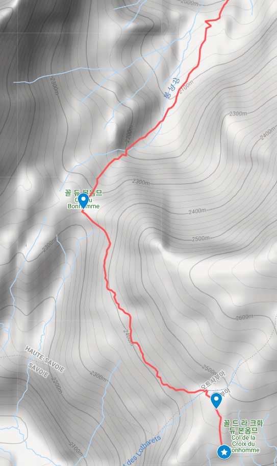 계속적으로 이어진 오르막은 본옴므고개(Col du Bonhomme, 2329m)에서 잠시 숨을 고르지만 본옴므 산장 고개(Col de La Croix du Bonhomme, 2479m)까지 조금 더 이어집니다.