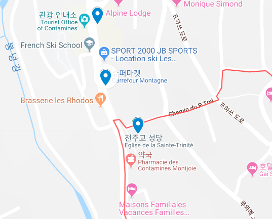 레 꽁따민느(Les Contamines) 시내에 도착하면 우선 레 꽁따민느-몽주와 트리니티 성당(Eglise de la Sainte-Trinité)을 방문합니다. 1759년에 건축이 시작되어 1776년에 봉헌된 바로크 양식의 성당입니다. 성당을 방문한 다음에는 시내 슈퍼에서 필요한 물품을 구입합니다. 앞으로 이틀 연속 산장에서 묵어야 하므로 이를 감안해야 합니다. 까르프 (Carrefour Montagne)는 8시에 문을 열고 슈퍼 마르세 셰르파(Supermarché SHERPA)는 07:30에 문을 엽니다.