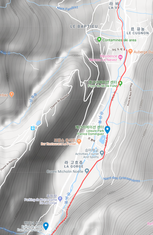 레 꽁따민느(Les Contamines) 시내는 본옴므 고개에서 흘러내려오는 봉넝강 따라 걷습니다. 가는 길에는 시립 공원(Leisure Park Patrice Dominguez)을 지나고 계곡 입구에서는 900여 년 전 여행자를 위해 세워졌다는 노트르담 예배당(Eglise de notre Dame de la Gorge, 1210미터)을 만날 수 있습니다.