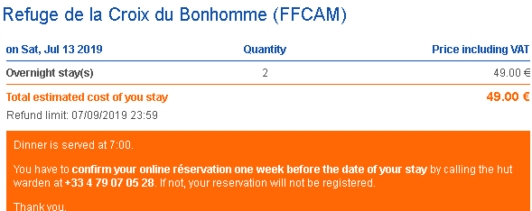 최종 목적지인 본옴므산장(Refuge de La Croix du Bonhomme, 2477m)은 TMB 경로에서 200미터 정도 떨어져 있습니다. 본오므산장(https://refugecroixdubonhomme.ffcam.fr/GB_le-mot-du-gardien.html)은 사이트에서 미리 예약했어도 1주일 전에 전화로(+33 4 79 07 05 28, refugecroixdubonhomme@ffcam.fr) 예약을 확인해야 하는 예약이 가장 까다로운 곳이었습니다.