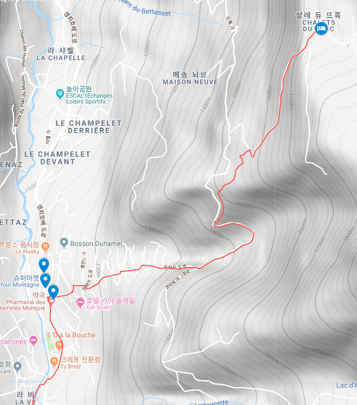 트휙 산장(Auberge du Truc)에서 오전 7시까지는 출발해야 무리 없이 다음 목적지인 본옴므산장(Refuge de La Croix du Bonhomme)에 도착할 수 있습니다. 16.8Km 내외의 거리로 휴식 감안하여 9시간 내외를 예상합니다. 트휙 산장을 출발하면 레 꽁따민느(Les Contamines) 시내까지 내리막 길이 이어집니다.