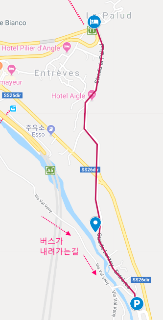 버스에 승차하고 20분 정도 이동하여 라 삭스 폰탈(La Saxe Pontal) 정류장에서 하차합니다. 버스 정류장에서 숙소까지 가는 버스를(924, 947번 - 1시간마다 있음) 타면 4 정거장만 이동하면 되지만 다음 여정을 위해서 슈퍼에 들러 숙소까지 2Km 정도를 걷습니다. 쿠르메이유(Courmayeur)는 몽블랑 남쪽 해발 1,200m에 위치한 이탈리아 최고의 산악 리조트 지역으로 이곳의 시내 모습을 감상하며 걷기 재미도 기대가 됩니다.