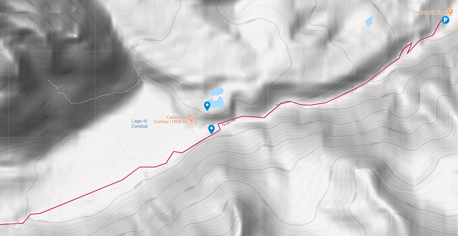 등산로는 내려가다가 미아지 호수 또는 콩발 호수(Lago di Miage or Combal)라 불리는 호수 근처에서 갈림길을 만나는데 저희는 등산로가 아닌 호수 쪽의 도로로 이동합니다. 현지 도착 시간과 1시간에 한번 출발하는 버스 시간을 확인해서 여유가 있다면 호수를 들렀다가 이동합니다.