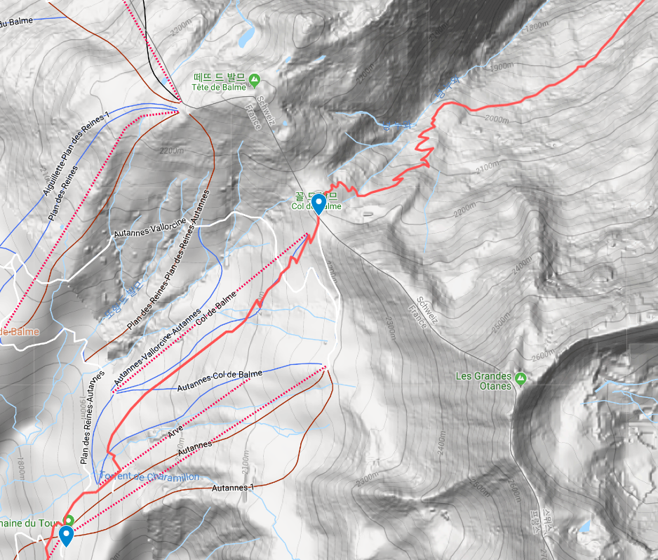 드디어 TMB 걷기 마지막 날입니다. TMB 걷기 7일 차까지 사고 없이 무사히 도착했다면 그것만으로도 감사한 일이 아닐까 싶습니다. 오늘은 6Km 내외의 거리를 걸어서 스위스와 프랑스의 경계인 발므 고개에 도달하면 그 이후는 몽록(Montroc)까지 5Km 내외의 내리막 길을 걷습니다. 출발지인 트리앙의 고도가 1,279m, 발므 고개가 2,191m, 몽록(Montroc)이 위치한 르 뚜흐(Le Tour)가 1,453m이니까 900미터 가량의 고도를 올렸다가 700미터 정도를 내려야 합니다. 저희의 공식적인 TMB 걷기를 몽록에서 끝내면 기차로 샤모니로 이동하여 르 브레방(Le Brévent) 케이블카를 타고 몽블랑을 제대로 조망할 수 있는 르 브레방(Le Brévent) 정상을 다녀옵니다. 샤모니의 일정을 마치면 미리 예약해둔 위버스(OuiBUS)를 타고 제네바 공항으로 이동하여 공항 근처 호텔에서 이번 여행 마지막 밤을 보내고 아침 비행기로 제네바를 떠나 한국으로 돌아가는 여정입니다.
